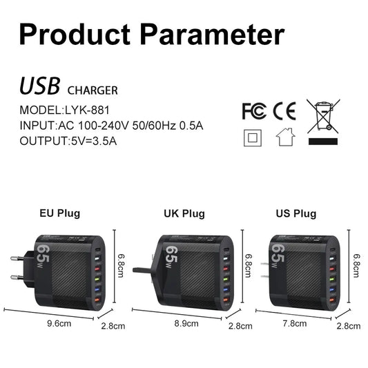 6 portů USB Type C Nabíječka PD Fast Charge Adapter Rychlé nabíjení 3.0 pro iPhone Samsung Xiaomi Huawei Zásuvka pro nabíječku telefonu #3