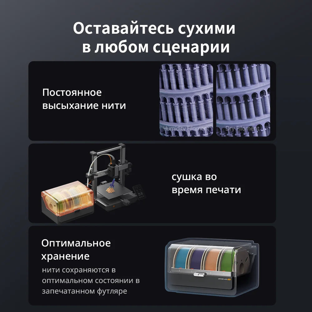 ACE Pro dodává filament jednotlivě prostřednictvím čtyř trubic, zkrácenou délku filamentu při změně barvy nebo zálohování filamentu. A ACE Pro podporuje automatické zakládání a vyjímání vláken, aby se eliminovaly nepořádky nebo zamotávání. Vestavěný Buffer detekuje ucpání trysek, pozastaví tisk a okamžitě upozorní, aby účinně chránil stroj.
