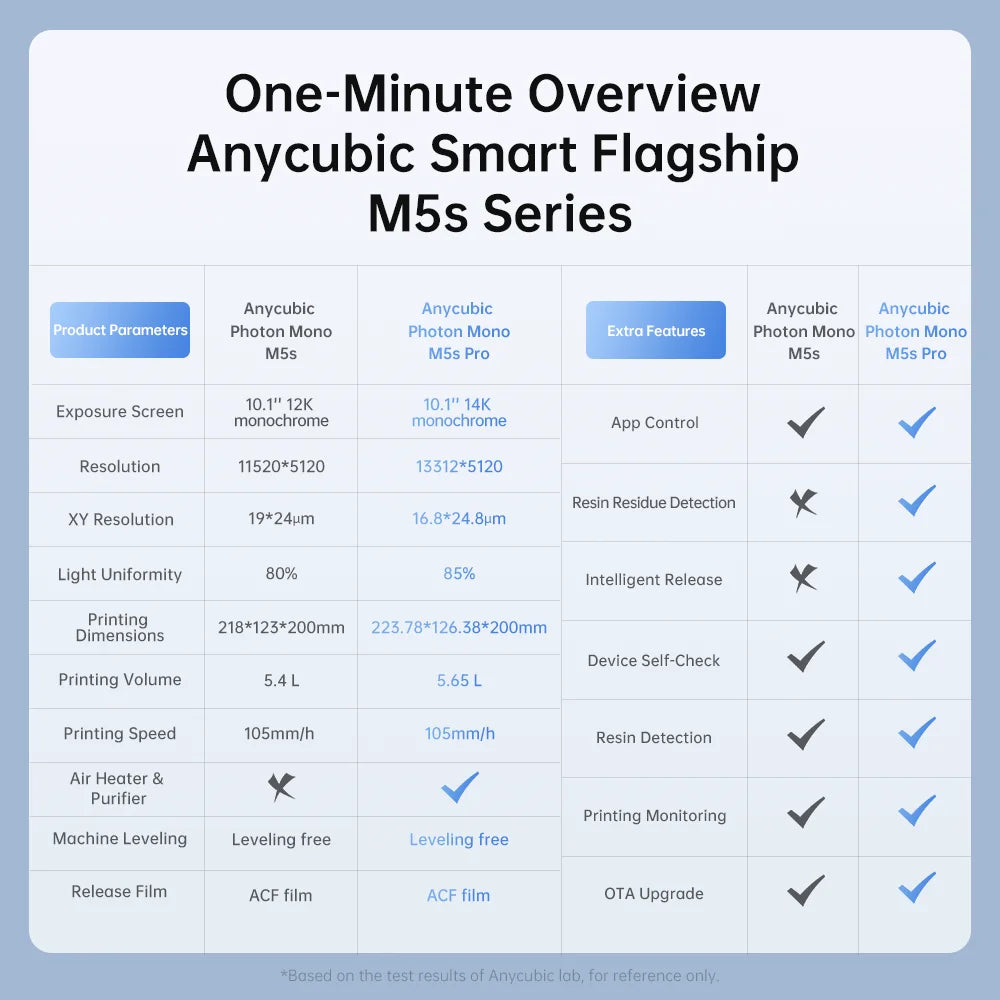 S maximální rychlostí tisku až 150 mm/h, při použití s vysokorychlostní pryskyřicí Anycubic, při nastavení parametrů 0,1 mm výška vrstvy a tloušťka pláště 2 mm, data pocházejí z testů Anycubic Laboratory.
