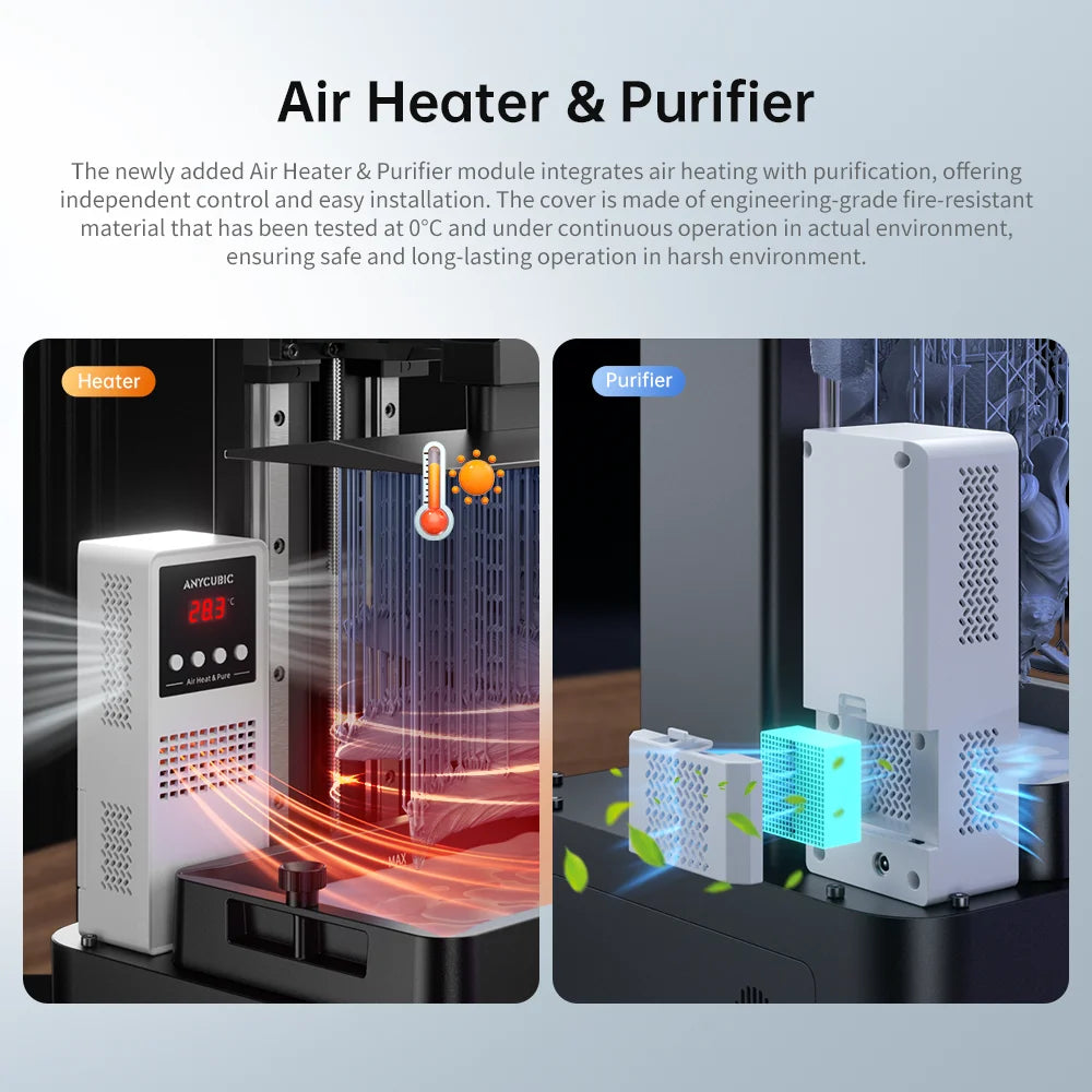 Podporuje ohřev vzduchu zajišťující teplotu vzduchu až 40 ℃ a udržuje teplotu pryskyřice před tiskem nad 20 ℃ pro dosažení úspěšného tisku i v prostředí s nízkou teplotou. Kromě toho je podporován vyhrazený režim čištění s vestavěnou vysoce kvalitní složkou aktivního uhlí, která účinně pohlcuje pachy pryskyřice a vytváří pohodlné tiskové prostředí.
