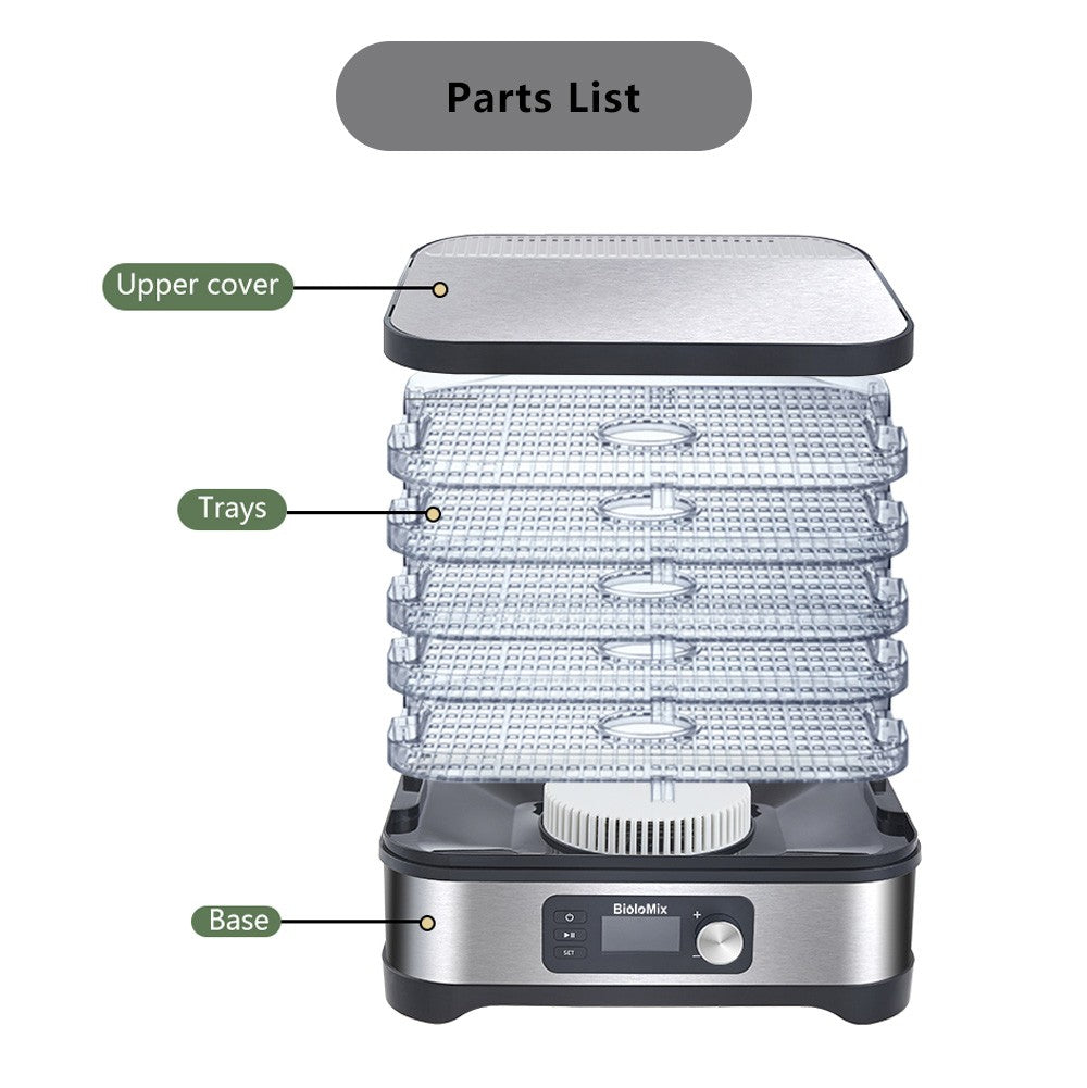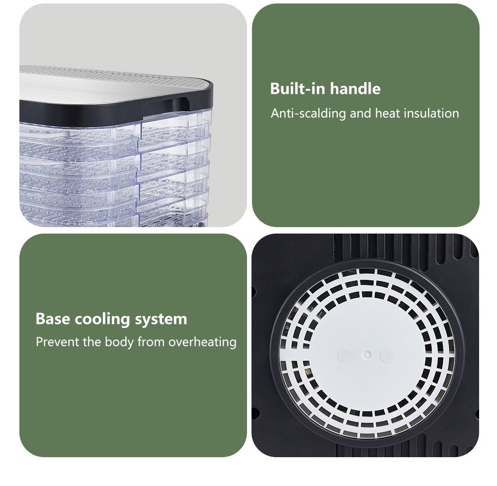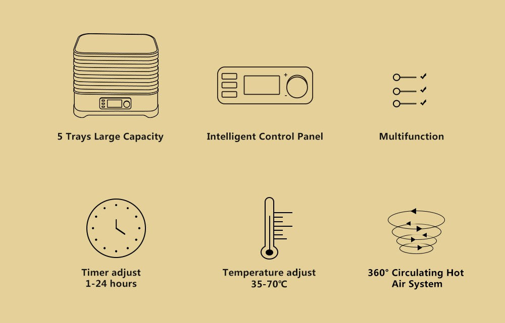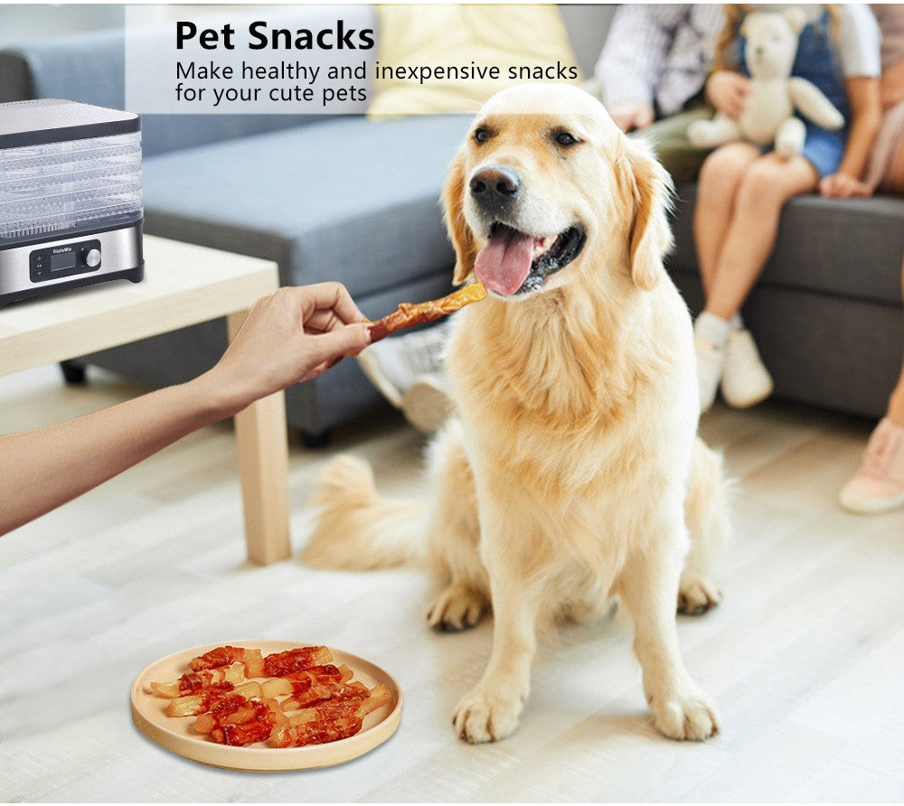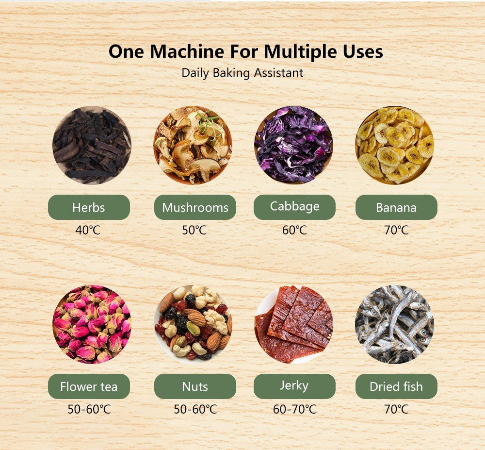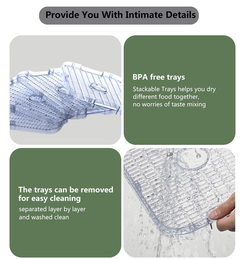 Sušička je odnímatelná a tácy lze mýt v myčce nádobí, což usnadňuje a zjednodušuje čištění a skladování. Je ideální pro sušení ovoce, zeleniny, masa, bylinek a hub nebo pro přípravu sušeného hovězího, krůtího, rybího a jakéhokoli jiného domácího jídla. Lze ji také použít k výrobě žvýkacích pamlsků a svačinek pro vaše domácí mazlíčky.