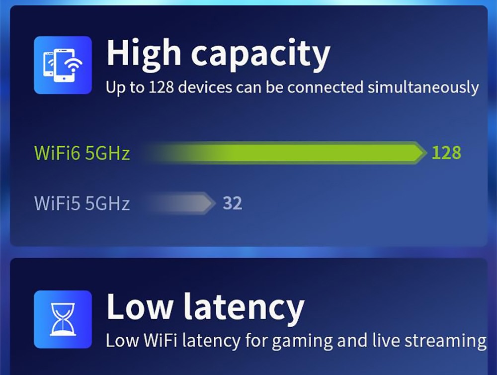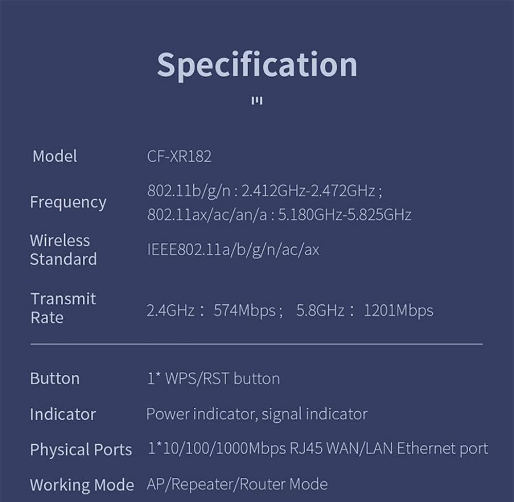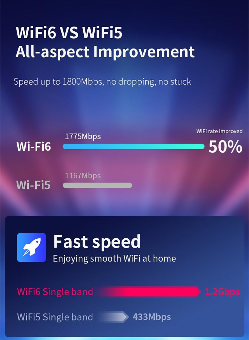 | Transmission Rate :2.4GHz :574Mbps ; 5.8GHz :1201Mbps | |