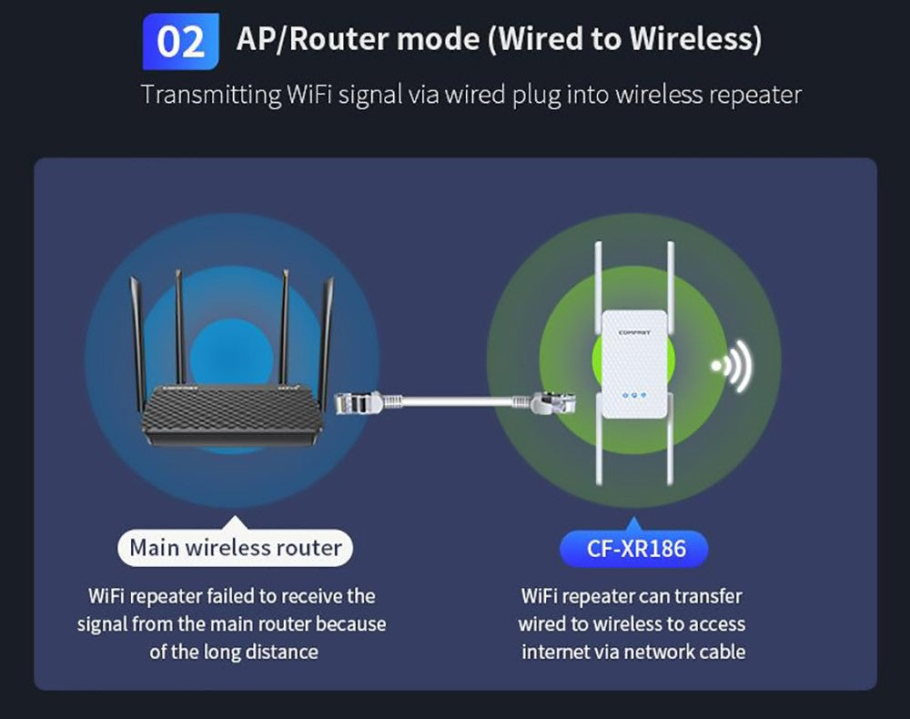 - Režim AP/routing (kabelové připojení k bezdrátovému): Připojte síťový kabel k zesilovači pro přenos WiFi signálů.
