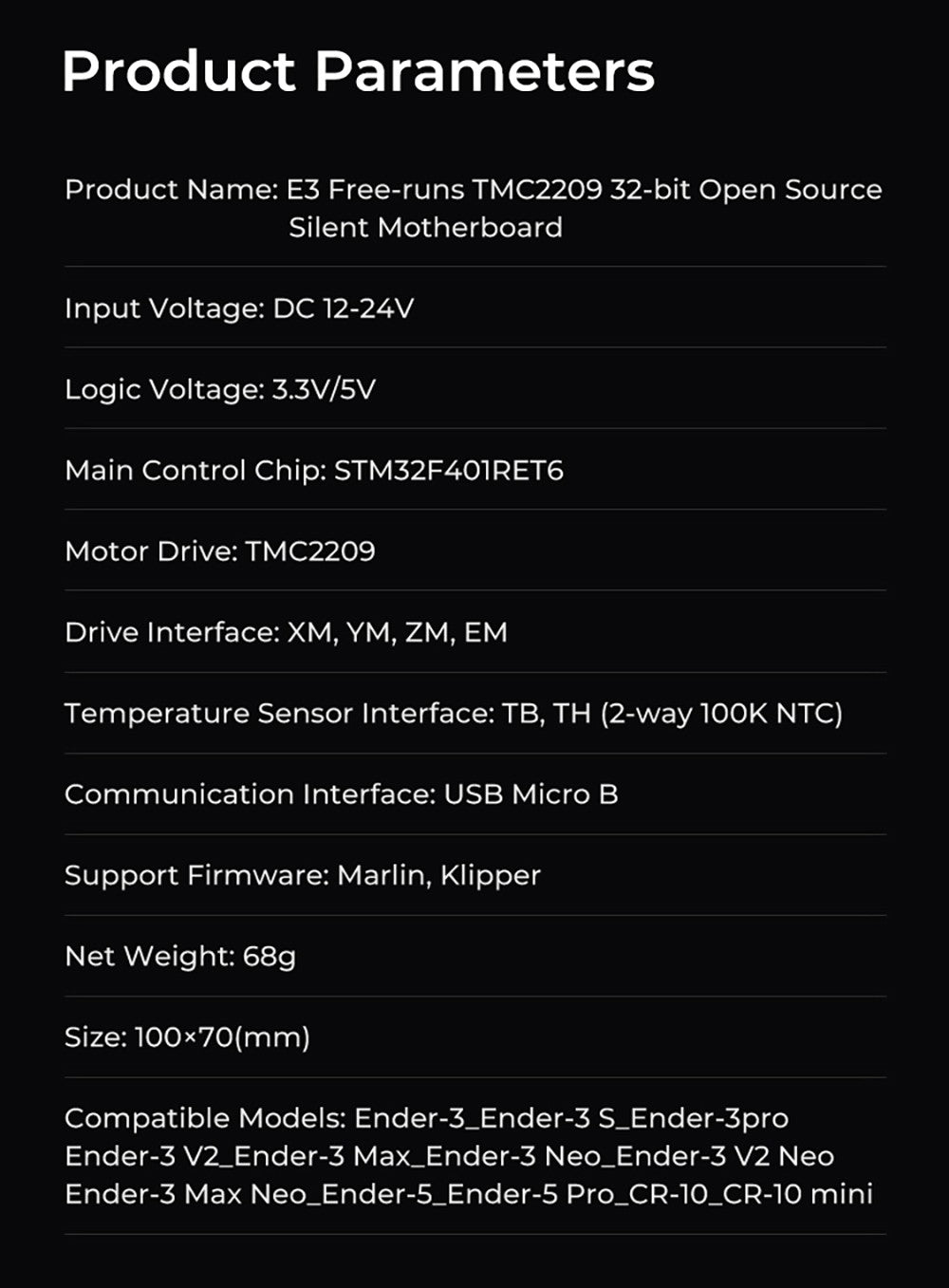 | Compatible Models | Ender-3/Ender-3 S/Ender-3pro/Ender-3 V2/Ender-3 Max/Ender-3 Neo/Ender-3 V2 Neo/Ender-3 Max Neo/Ender-5/Ender-5 Pro/CR-10/CR-10 mini |