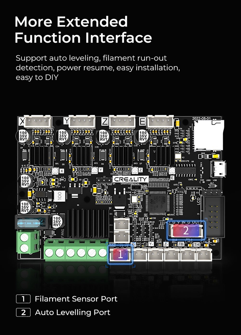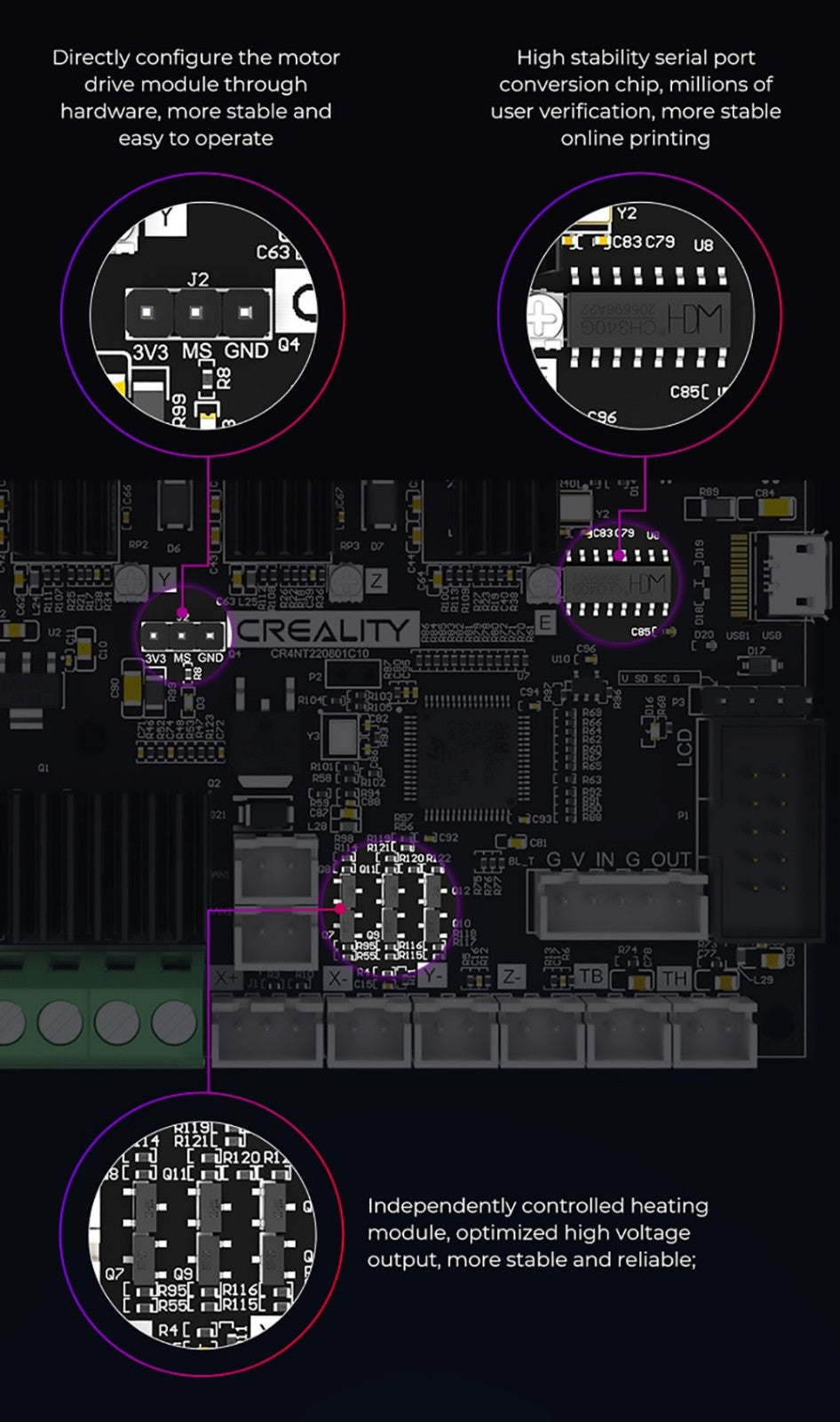 Díky integraci pohonů a řídicích jednotek může základní deska spouštět samostatný firmware Marlin nebo volně spouštět firmware Klipper s Raspberry Pi.