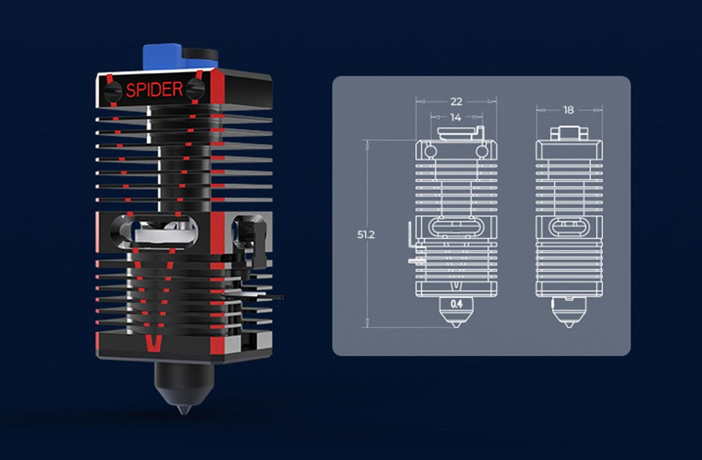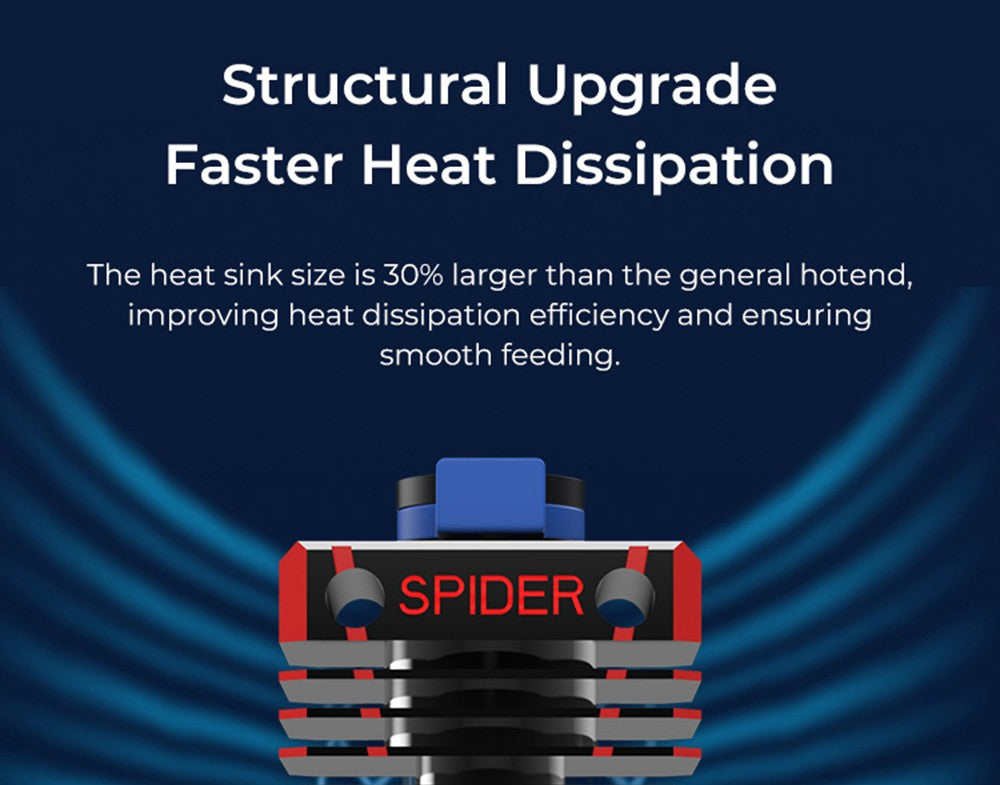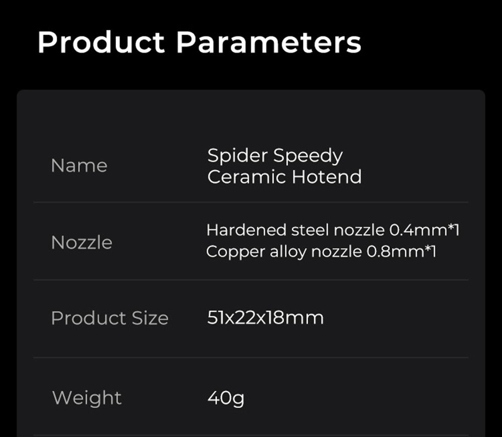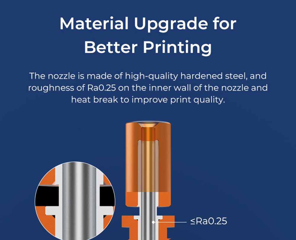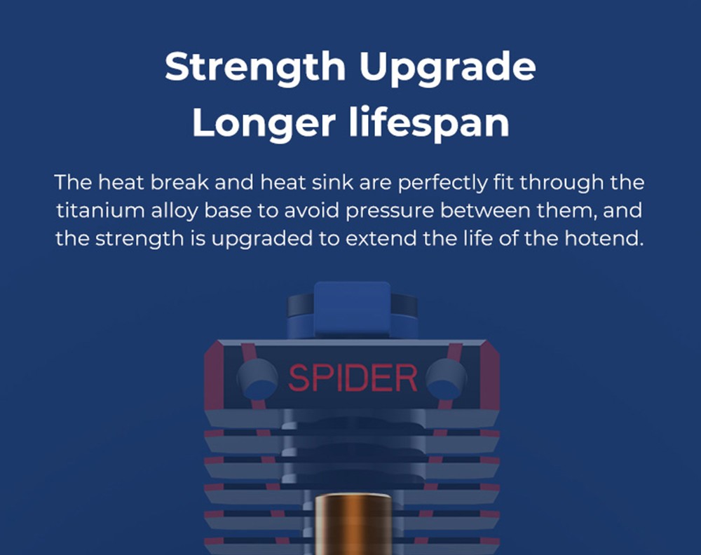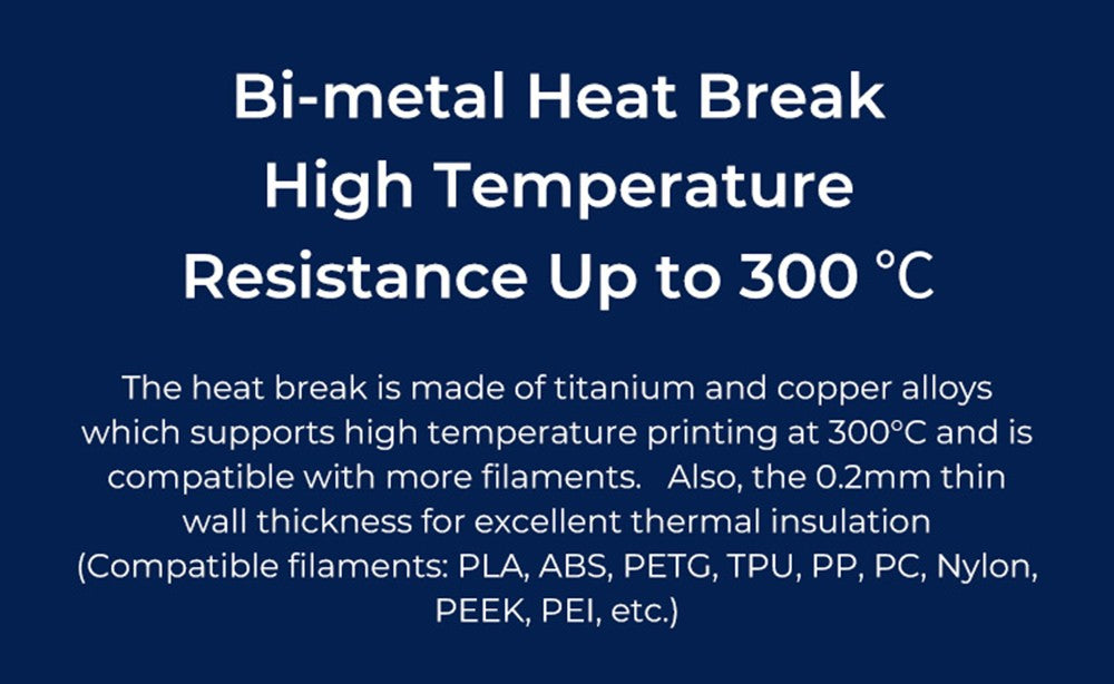 Tepelněizolační přepážka je vyrobena ze slitin titanu a mědi, které podporují vysokoteplotní tisk při 300 °C a jsou kompatibilní s více filamenty. Tloušťka stěny 0,2 mm zajišťuje vynikající tepelnou izolaci.