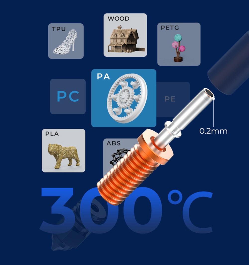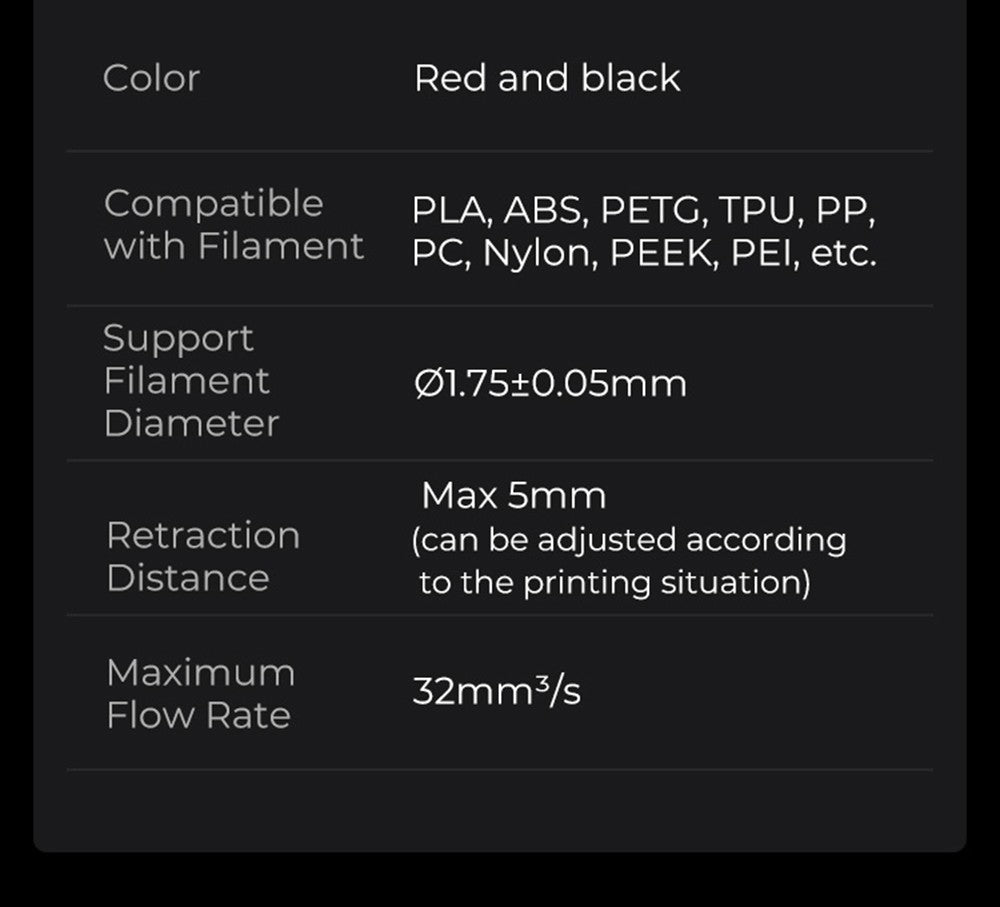 | Compatible with Filament | PLA, ABS, PETG, TPU, PP, PC, Nylon, PEEK, PEI, etc. |