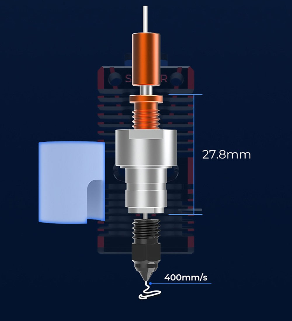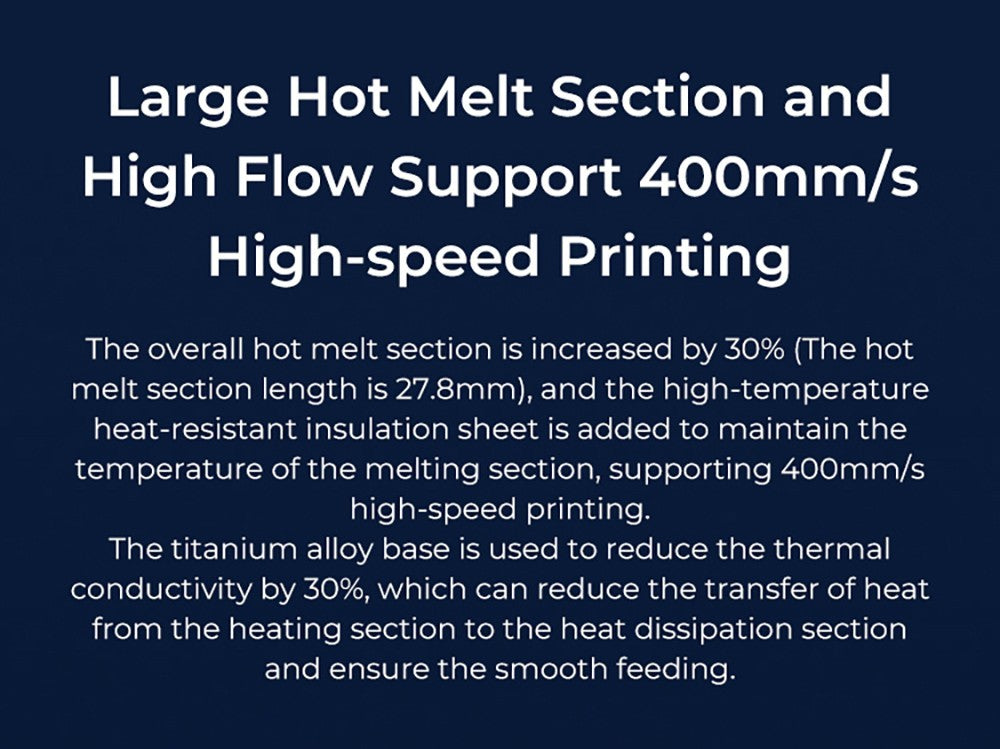 Celková sekce tavného lepidla je zvětšena o 30 % (délka sekce tavného lepidla je 27,8 mm) a pro udržení teploty tavné sekce je přidána tepelně odolná izolační vrstva odolná vůči vysokým teplotám, což umožňuje vysokorychlostní tisk 400 mm/s.