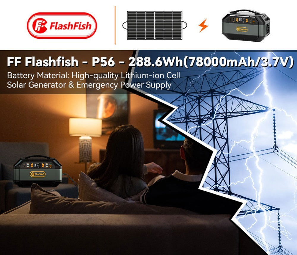 Venkovní elektrárna Flashfish P56 má kapacitu 288,6 Wh, což je ideální pro různé druhy spotřeby energie - venkovní použití doma, pro cpap přístroje, při výpadku proudu, na cestách, při kempování, při dobrodružstvích a při dlouhých cestách.