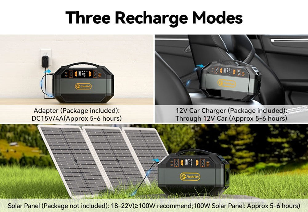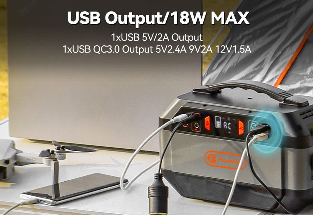 Přenosná napájecí stanice Flashfish P56 je vybavena 1 x AC zásuvkou (330 W, 600 W peak), 4 x DC porty (12 V/10 A max.), 2 x USB-C porty, 1 x QC3.0 USB portem, 1 x USB portem (5 V/2 A). Může napájet váš chytrý telefon, notebook, fotoaparát, drony, automobilové přístroje, CPAP přístroj, ledničku, mixér a další.