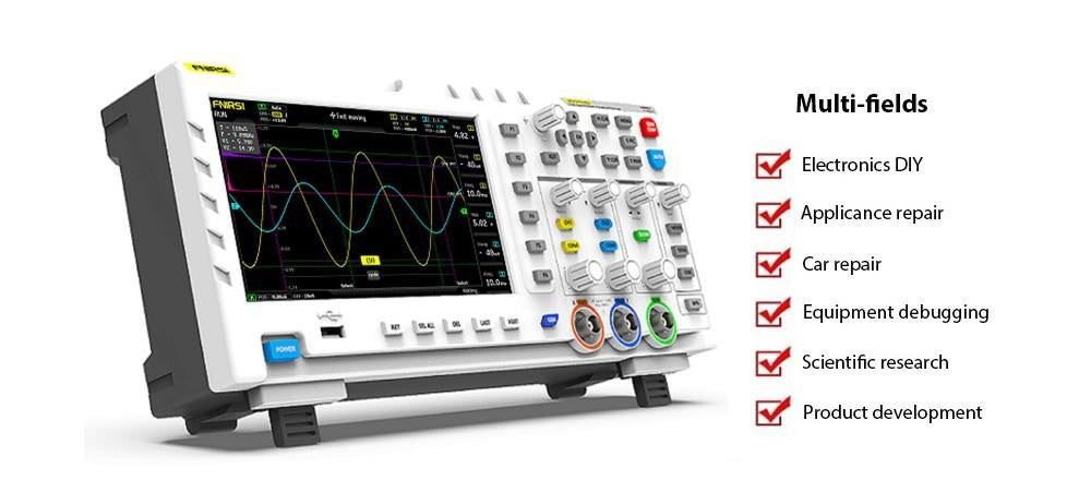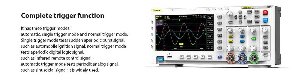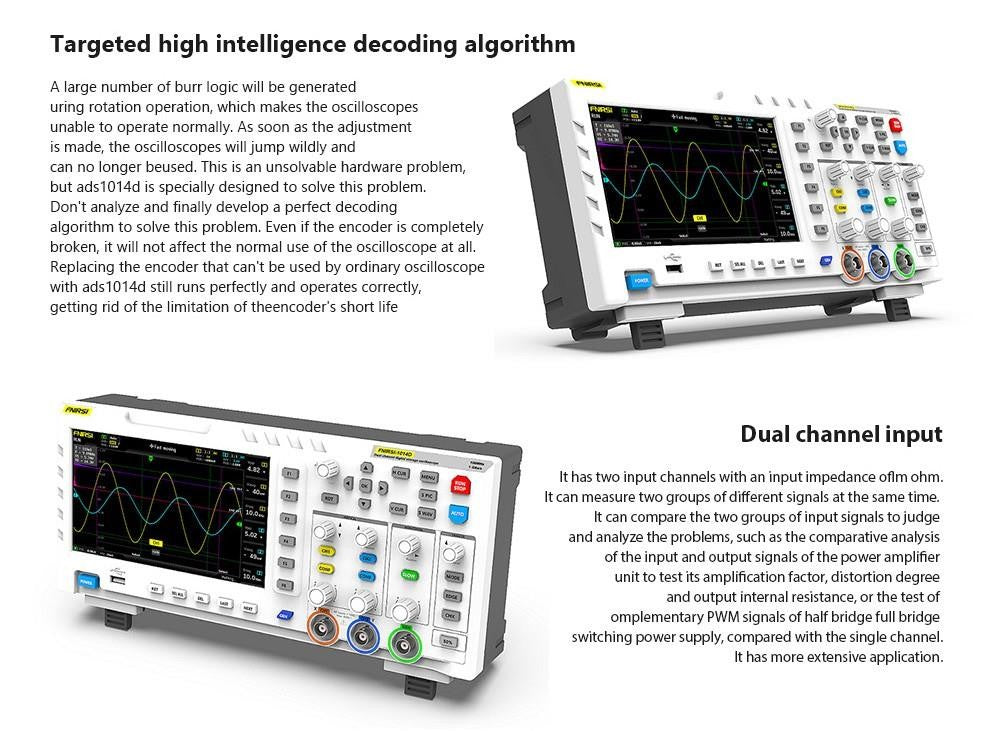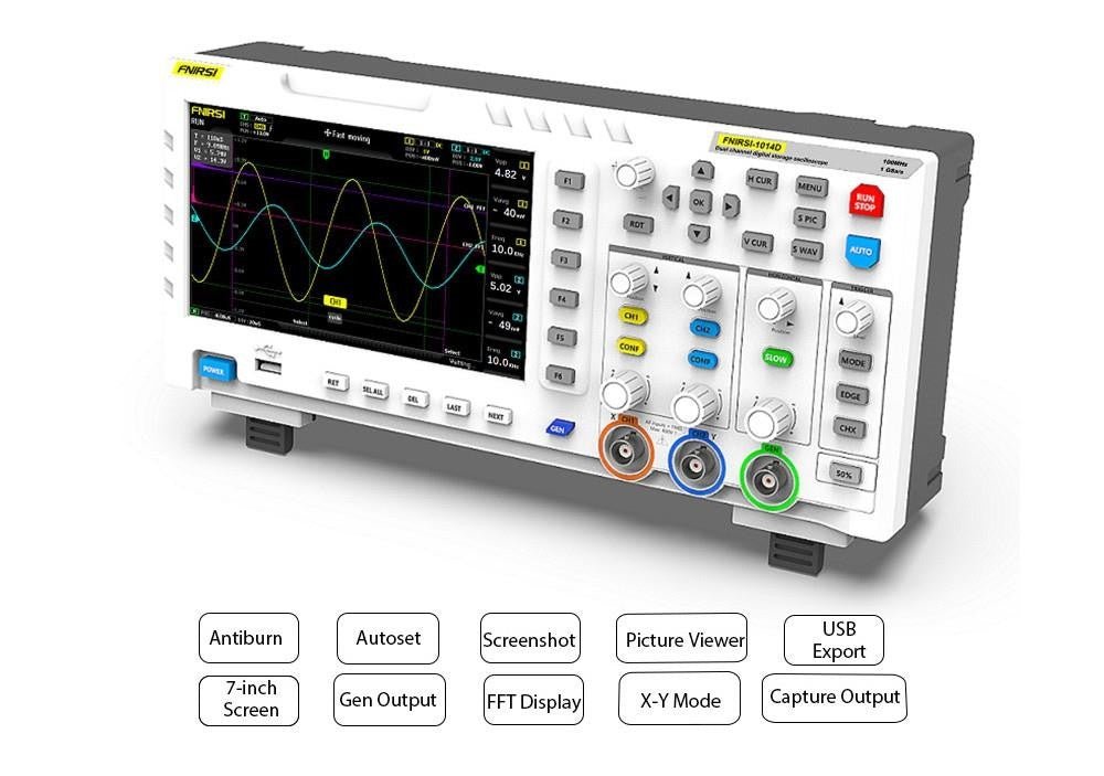 FNIRSI 1014D je osciloskop a generátor signálu 2 v 1 s vzorkovací frekvencí v reálném čase až 1 GSA/S a analogovou šířkou pásma 100 MHz * 2. Osciloskop FNIRSI má kompletní funkci spouštění (jednoduché/normální/automatické) a lze jej volně používat jak pro periodické analogové signály, tak pro aperiodické digitální signály.