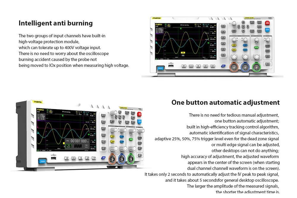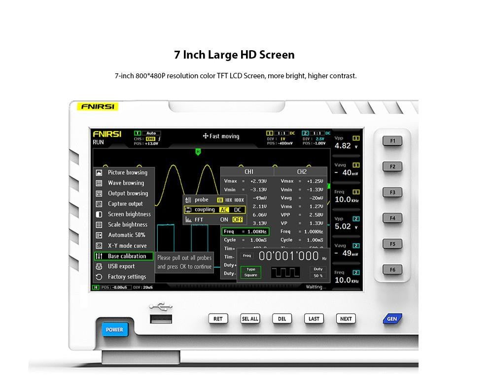 FNIRSI 1014D je vybaven vysoce účinným automatickým režimem s jedním tlačítkem a adaptivním spouštěním 25 %, 50 % a 75 % a dokáže zobrazit naměřený průběh bez nutnosti pracného nastavování; displej je vybaven 7palcovým LCD displejem s vysokým rozlišením 800*480.