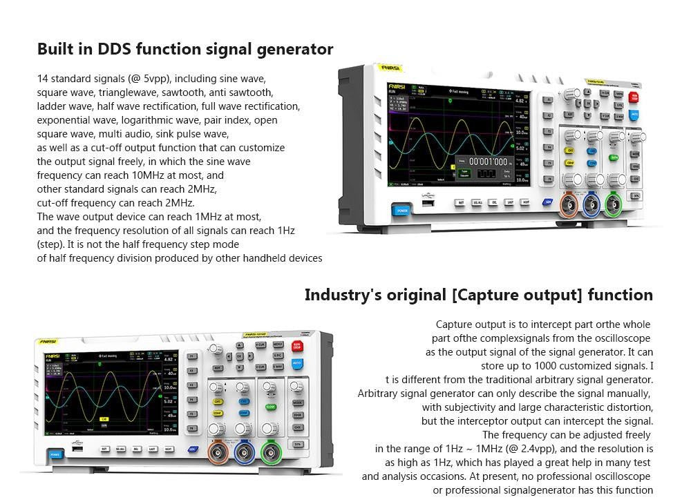 Vestavěný generátor signálů s funkcí DDS a originální průmyslový sekací výstup (@2,5 VPP), všechny kroky frekvence signálu jsou 1 Hz, podpora 14 druhů standardních funkčních signálů a přizpůsobitelný sekací signál. Sekací výstupní zařízení zachycuje část nebo celou část komplexních signálů měřených osciloskopem jako výstupní signál generátoru signálu, který může uložit až 1000 přizpůsobených sekacích signálů.