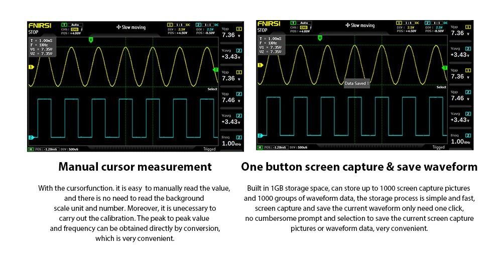 Funkce měření kurzoru umožňuje ručnímu odečítání parametrů amplitudy a frekvence bez nutnosti odečítat jednotku a množství na stupnici pozadí a lze přímo získat hodnotu a frekvenci mezi špičkami bez převodu.