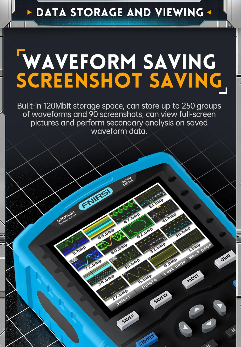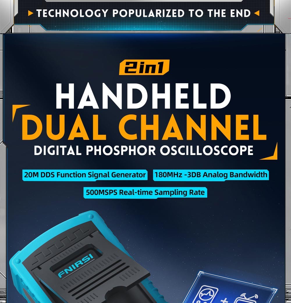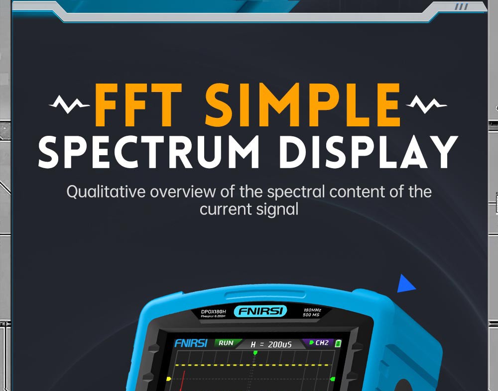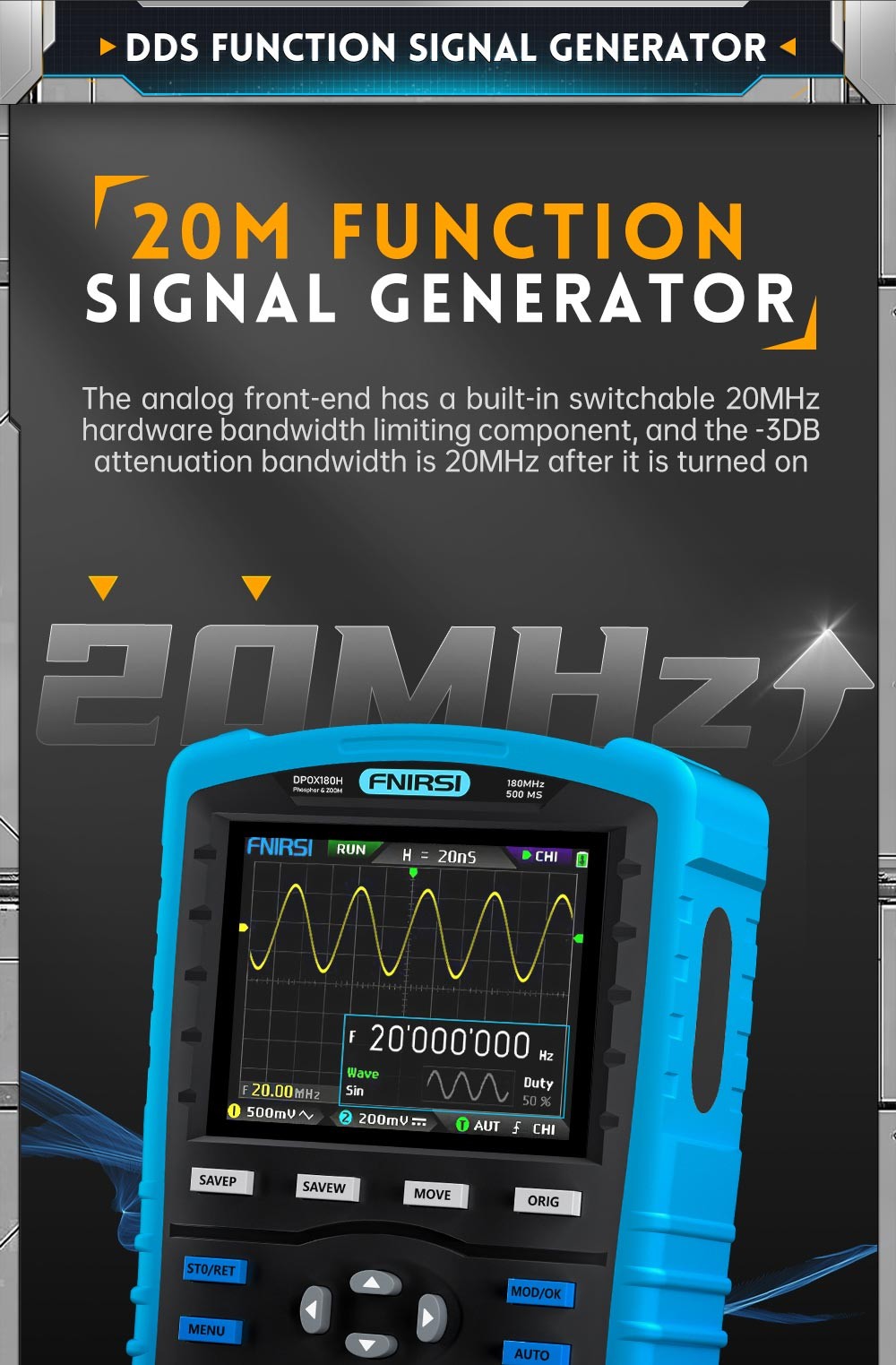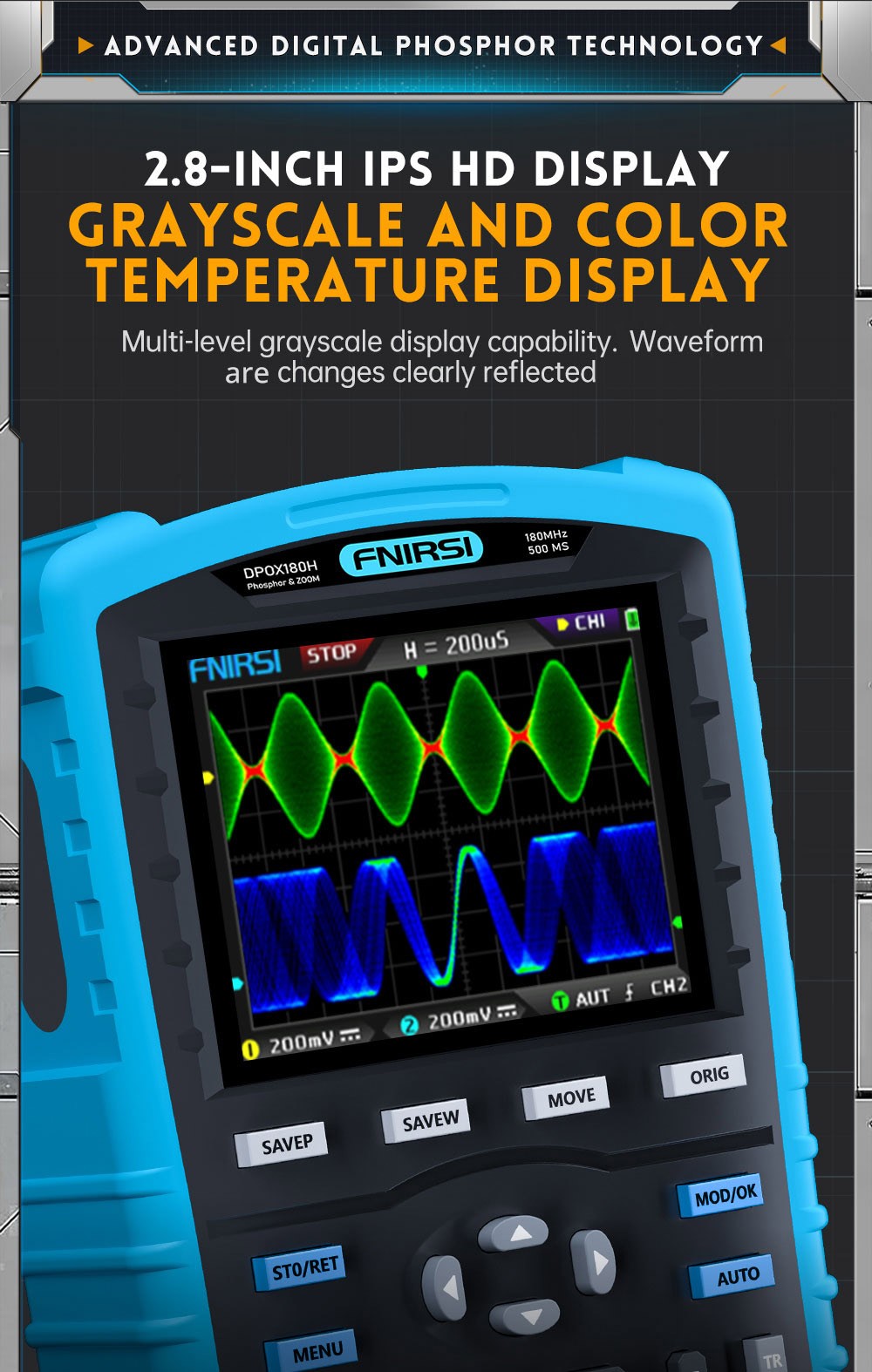 DPOX180H je cenově dostupný ruční 2kanálový digitální fosforový osciloskop s funkcí generátoru signálu. Osciloskop má vzorkovací frekvenci v reálném čase 500 MSPS a analogovou šířku pásma 180 MHz. Pokud jde o displej, používá vysoce kontrastní 2,8palcový IPS LCD displej s plným zobrazením a digitální fluorescenční technologii. Zobrazení tvaru vlny je dobré a barevné varianty jsou v odstínech šedi a barevné teplotě.