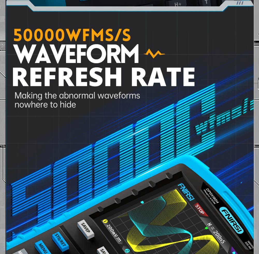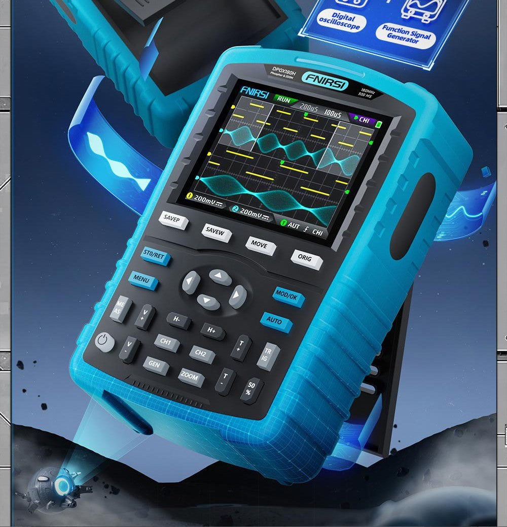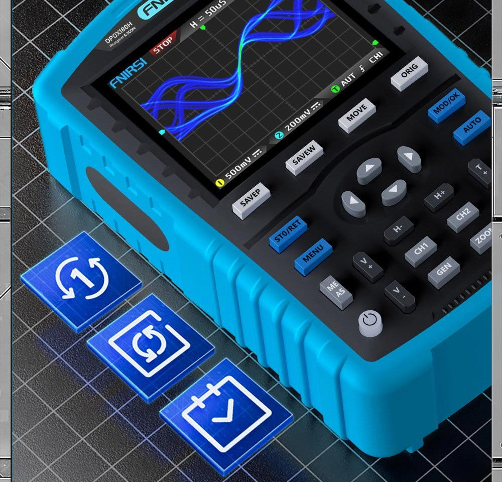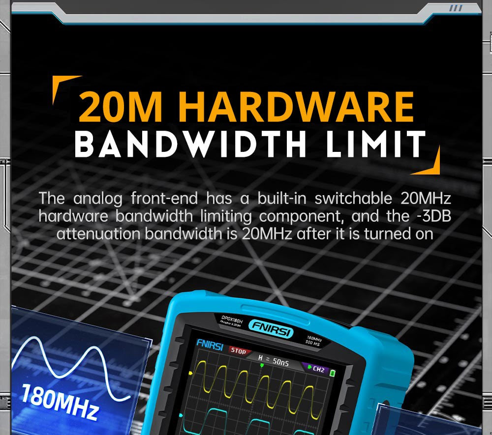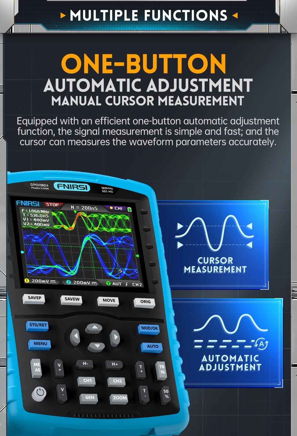 DPOX180H je cenově dostupný ruční 2kanálový digitální fosforový osciloskop s funkcí generátoru signálu. Osciloskop má vzorkovací frekvenci v reálném čase 500 MSPS a analogovou šířku pásma 180 MHz. Pokud jde o displej, používá vysoce kontrastní 2,8palcový IPS LCD displej s plným zobrazením a digitální fluorescenční technologii. Zobrazení tvaru vlny je dobré a barevné varianty jsou v odstínech šedi a barevné teplotě.