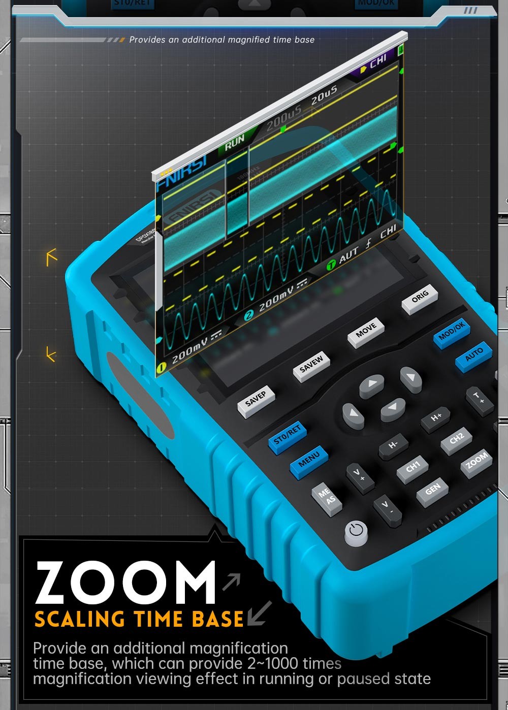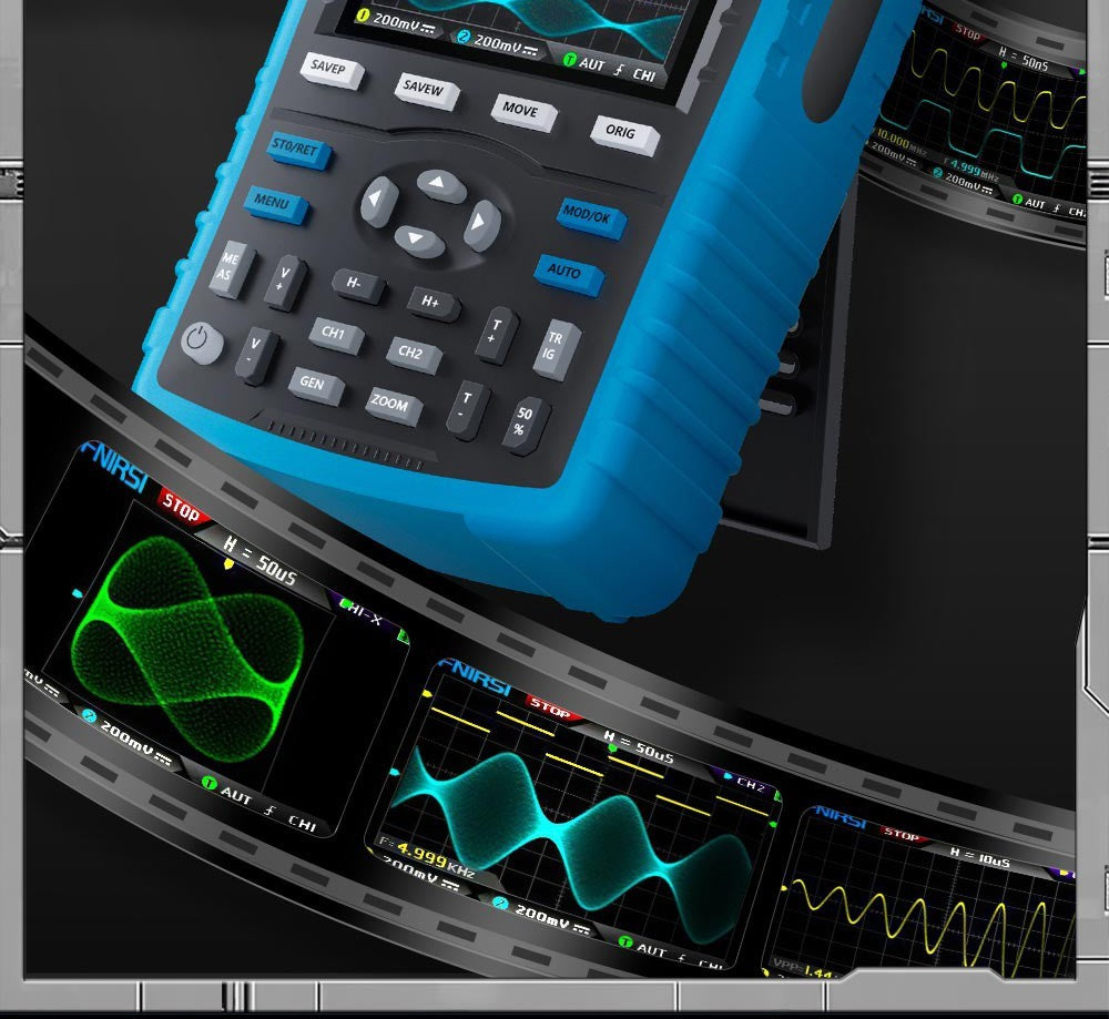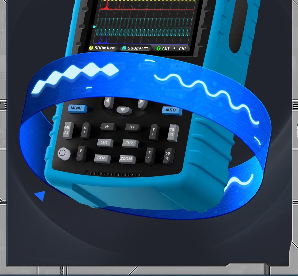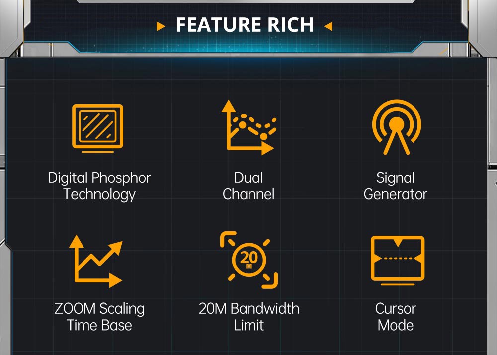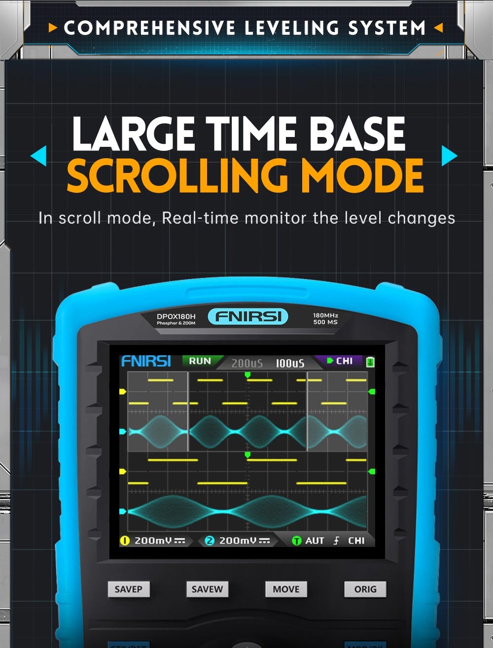 DPOX180H je cenově dostupný ruční 2kanálový digitální fosforový osciloskop s funkcí generátoru signálu. Osciloskop má vzorkovací frekvenci v reálném čase 500 MSPS a analogovou šířku pásma 180 MHz. Pokud jde o displej, používá vysoce kontrastní 2,8palcový IPS LCD displej s plným zobrazením a digitální fluorescenční technologii. Zobrazení tvaru vlny je dobré a barevné varianty jsou v odstínech šedi a barevné teplotě.