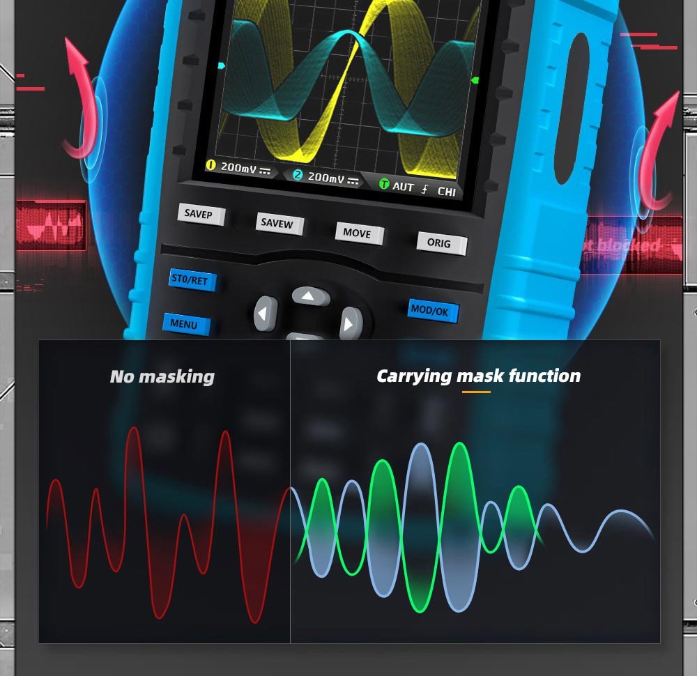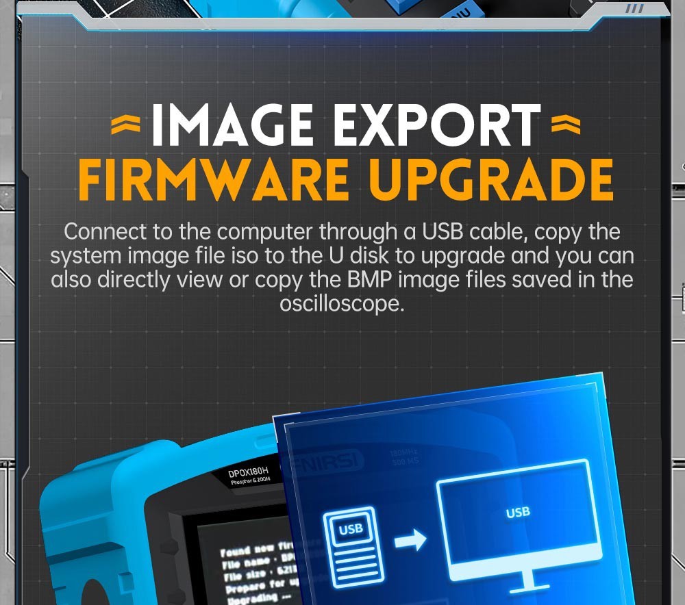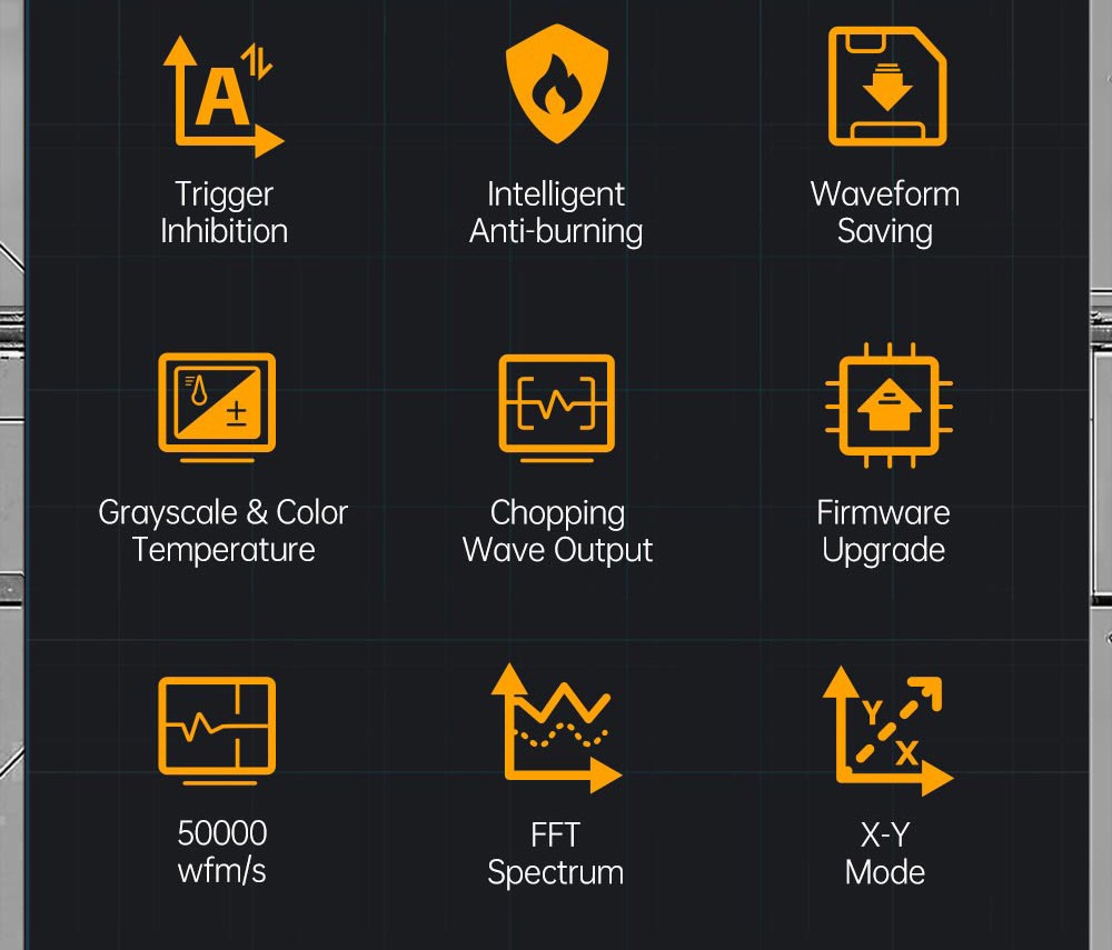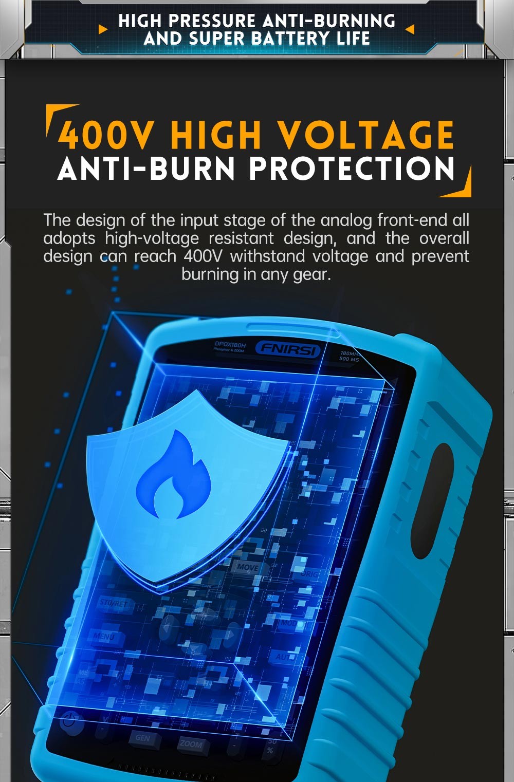 Díky ochraně proti přepálení při vysokém napětí odolávají všechna zařízení vysokému napětí až do 400 V. Export dat přes USB umožňuje připojení k počítači pro kopírování obrazových souborů a systémových souborů do osciloskopu pro upgrade systému. Rychlé nabíjení 5V2A, 1 hodina nabití na 80 %.
