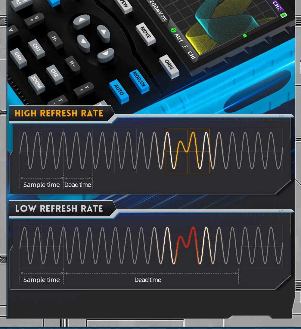 Díky obnovovací frekvenci tvaru vlny až 50 000 wfm/s je snazší zobrazit abnormální signály s nízkou pravděpodobností. Systém časové základny zahrnuje časovou základnu ZOOM pro snadnou analýzu signálů digitálního protokolu. Má tři režimy časové základny: YT, XY a rolování. Díky vertikální citlivosti až 5 mV dokáže lépe měřit malé signály 5 mVPP.