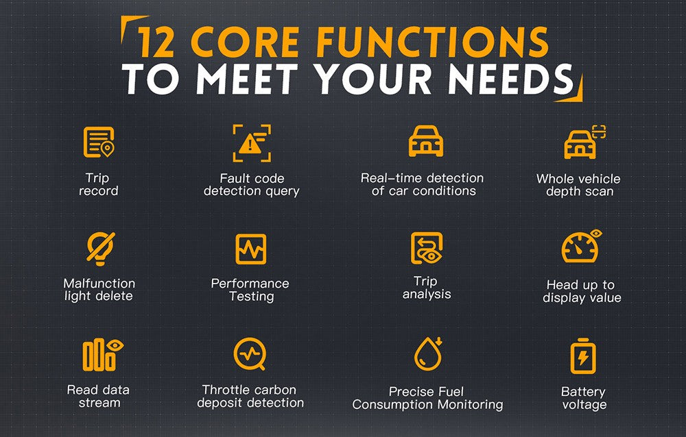 Detektor poruch automobilu FNIRSI FD10 OBD2 dokáže detekovat nebo vymazat chybové kódy a vysvětlit jejich význam, včetně testování výkonu, mazání kontrolek poruchy, zobrazení hodnoty na head-up displeji, analýzy spotřeby paliva, analýzy cesty, dotazu na detekci DTC, hloubkového skenování celého vozidla, detekce stavu vozidla v reálném čase atd.