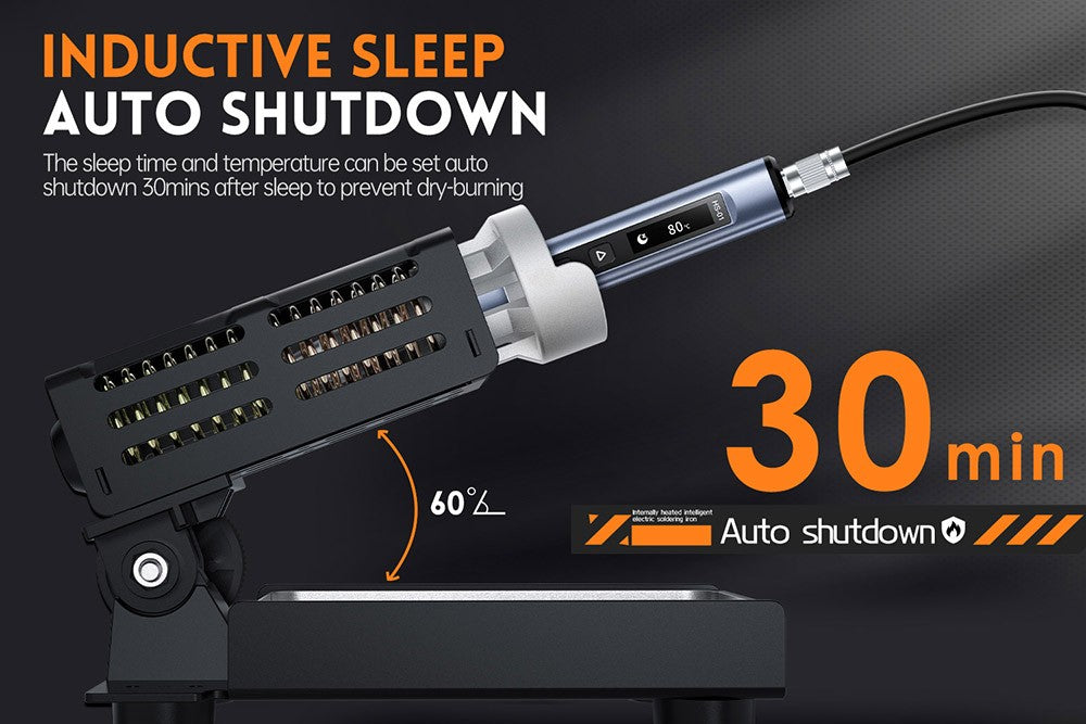 HS-01 dokáže inteligentně ovládat nárůst a pokles teploty hrotu a nabízí režim spánku, automatické vypnutí, dětský zámek a další režimy.