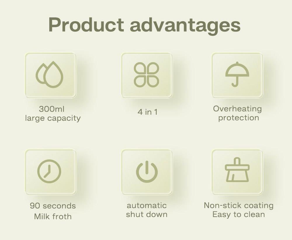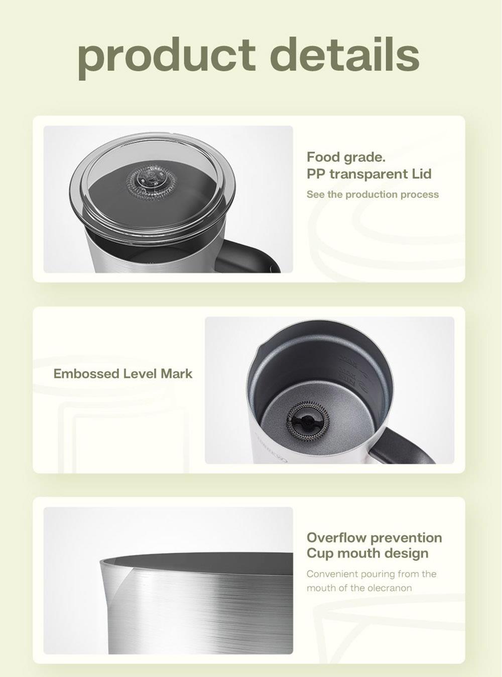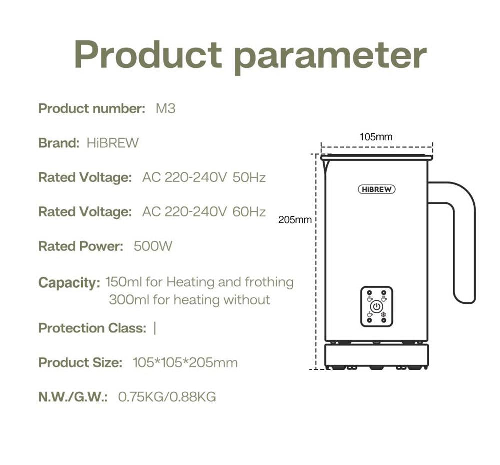 | Capacity | 150ml for heating and frothing; 300ml for heating |