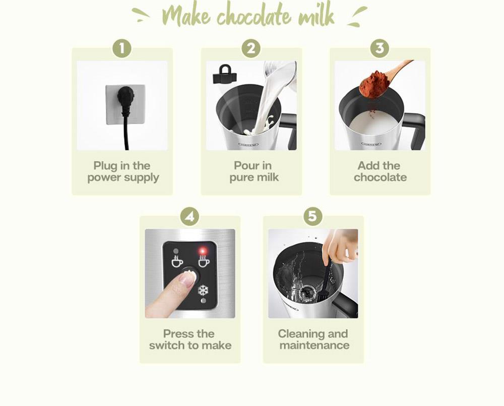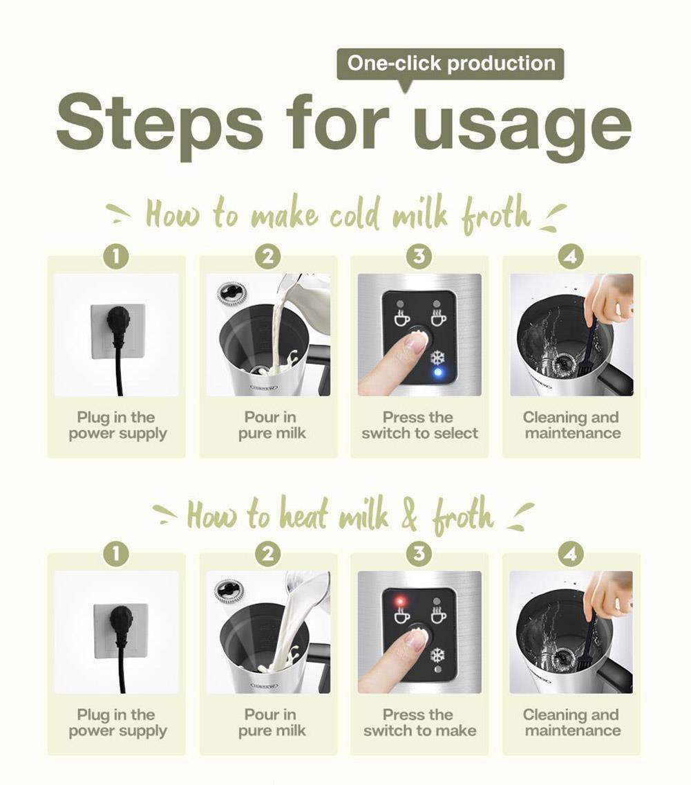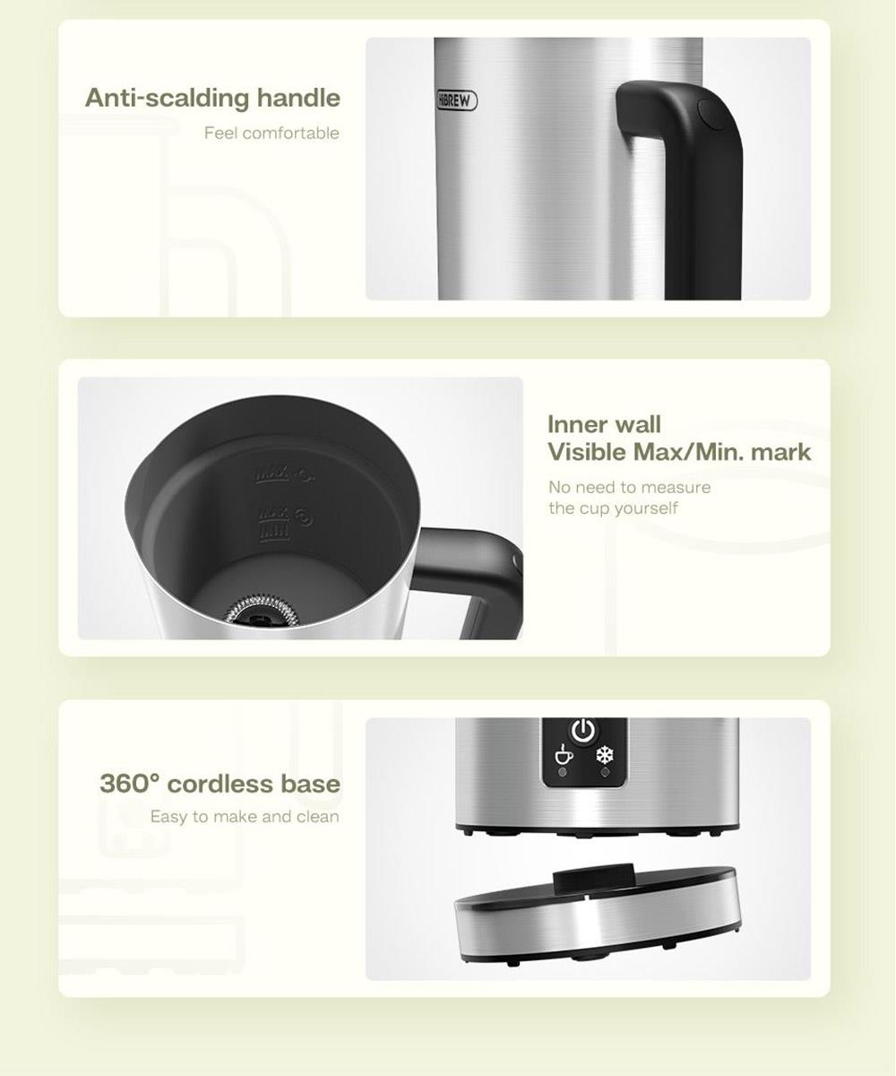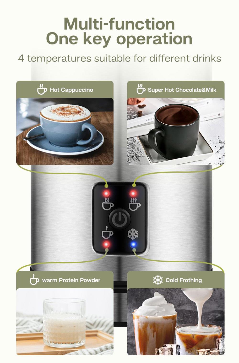 HiBREW M3 má čtyři teplotní režimy, které vám umožní připravit lahodné horké cappuccino, super horkou čokoládu s mlékem, teplý proteinový prášek a studenou pěnu.