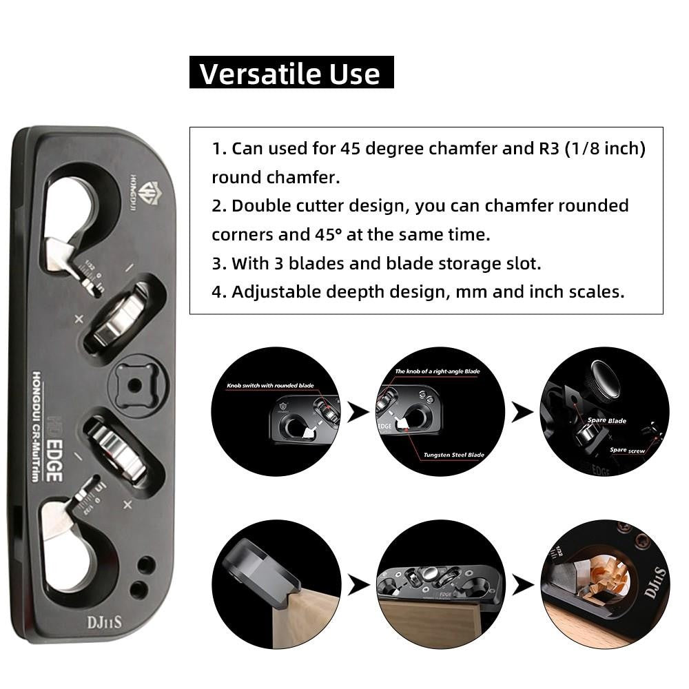 1. Srovnávací fréza na dřevo HONGDUI je dodávána se 3 náhradními karbidovými břitovými destičkami, je odolná a snadno se vyměňuje. Je navržena pro srážení hran pod úhlem 45 stupňů a ořezávání kulatých hran R3 (1/8 palce), jedna karbidová břitová destička umožňuje jak rovné, tak i kulaté řezy o průměru 1/8 palce.