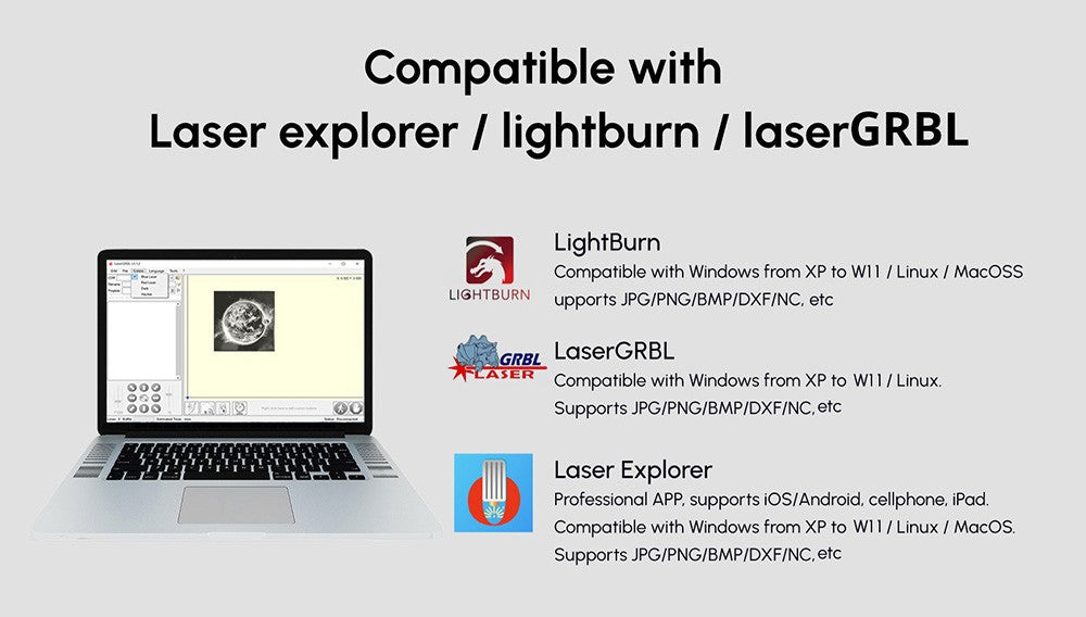 | Software Support: LaserExploer, LightBurn, LaserGRBL | |