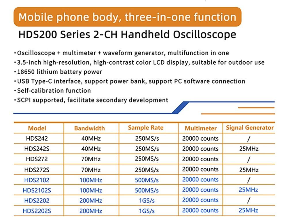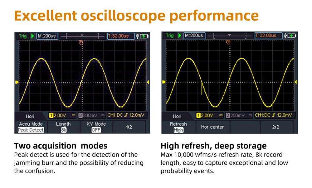 Nabízí dvoukanálový vstup, šířku pásma 100 MHz, vzorkovací frekvenci v reálném čase 500 MSa/s a maximální délku záznamu 8 kB. Má také funkci měření kurzoru a funkci automatického nastavení jedním tlačítkem, což umožňuje snadnou detekci a ladění.