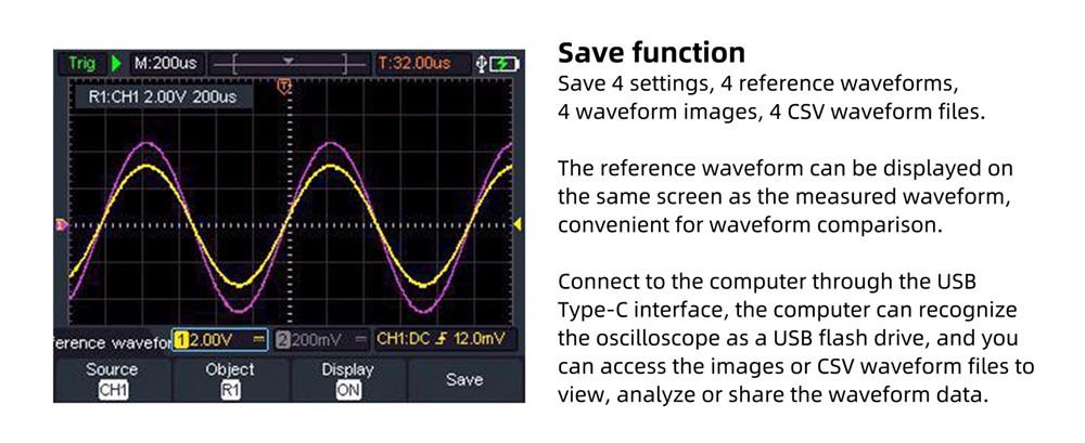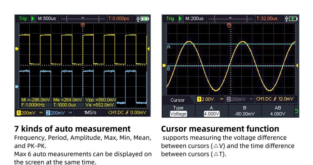 | Automatic Measurement: Frequency, Period, Amplitude, Max, Min, Mean, PK-PK | |