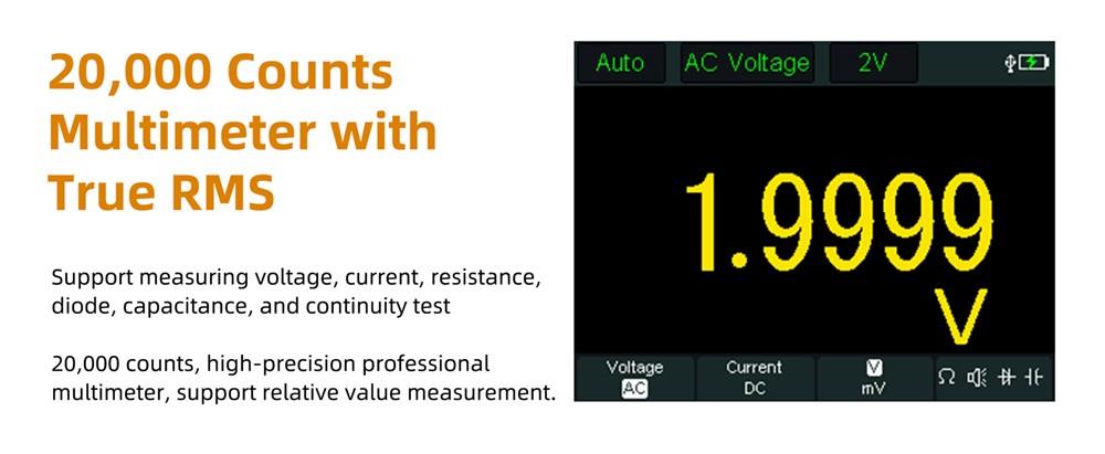 Multimetr s 20 000 měřicími jednotkami True RMS je vybaven funkcí automatického přepínání rozsahu a funkcí udržení naměřené hodnoty. Lze jej použít k měření standardního napětí, proudu, odporu, diod, kapacity a testu kontinuity. Konfiguruje maximální vstupní napětí AC 750 V a DC 1000 V. Nezávislý vstup multimetru a osciloskopu podporuje funkci relativního měření.