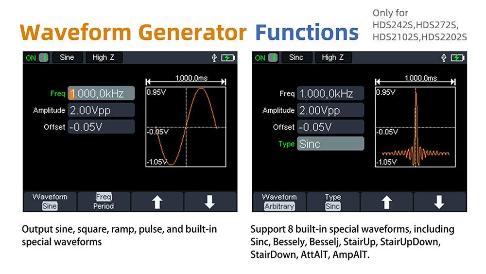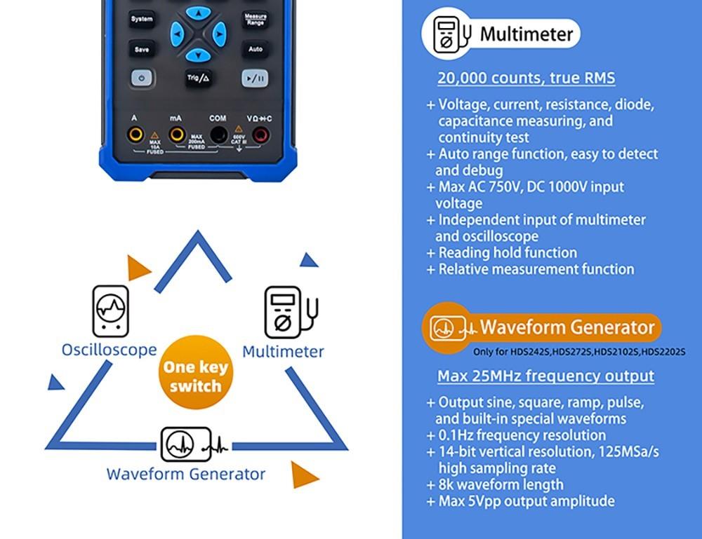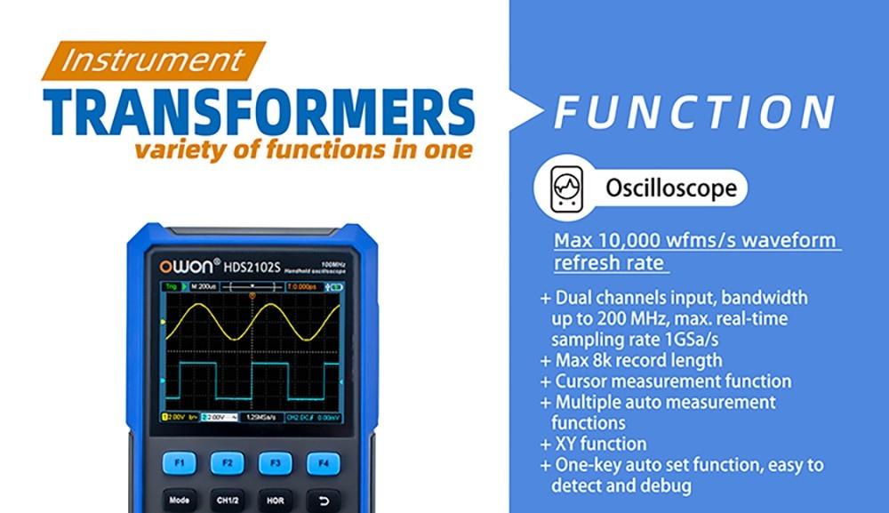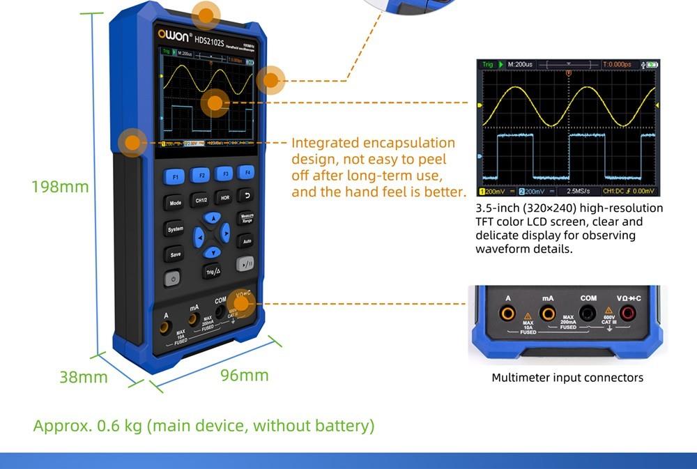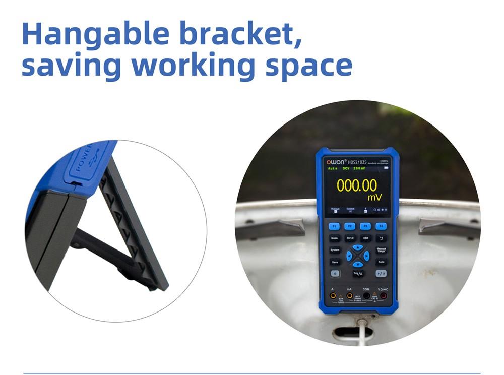 OWON HDS2102S není jen digitální osciloskop, ale také multimetr a generátor průběhů. Je snadno ovladatelný a vhodný pro venkovní údržbu, rychlé měření na místě, údržbu automobilů, detekci napájení atd.