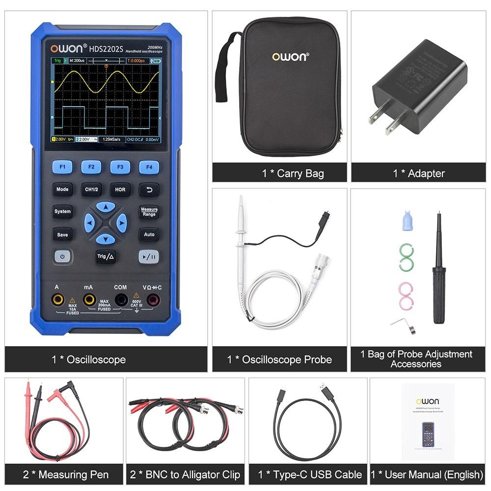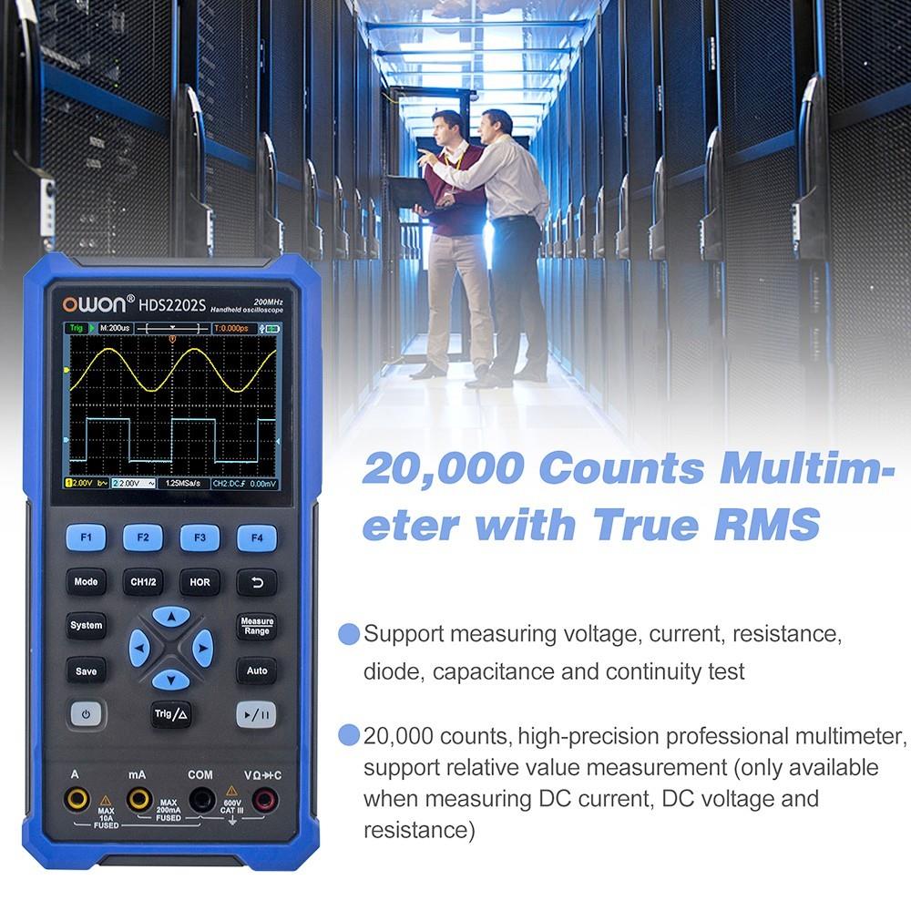 OWON HDS2202S není jen digitální osciloskop, ale také multimetr a generátor průběhů. Je snadno ovladatelný a vhodný pro venkovní údržbu, rychlé měření na místě, údržbu automobilů, detekci napájení atd.