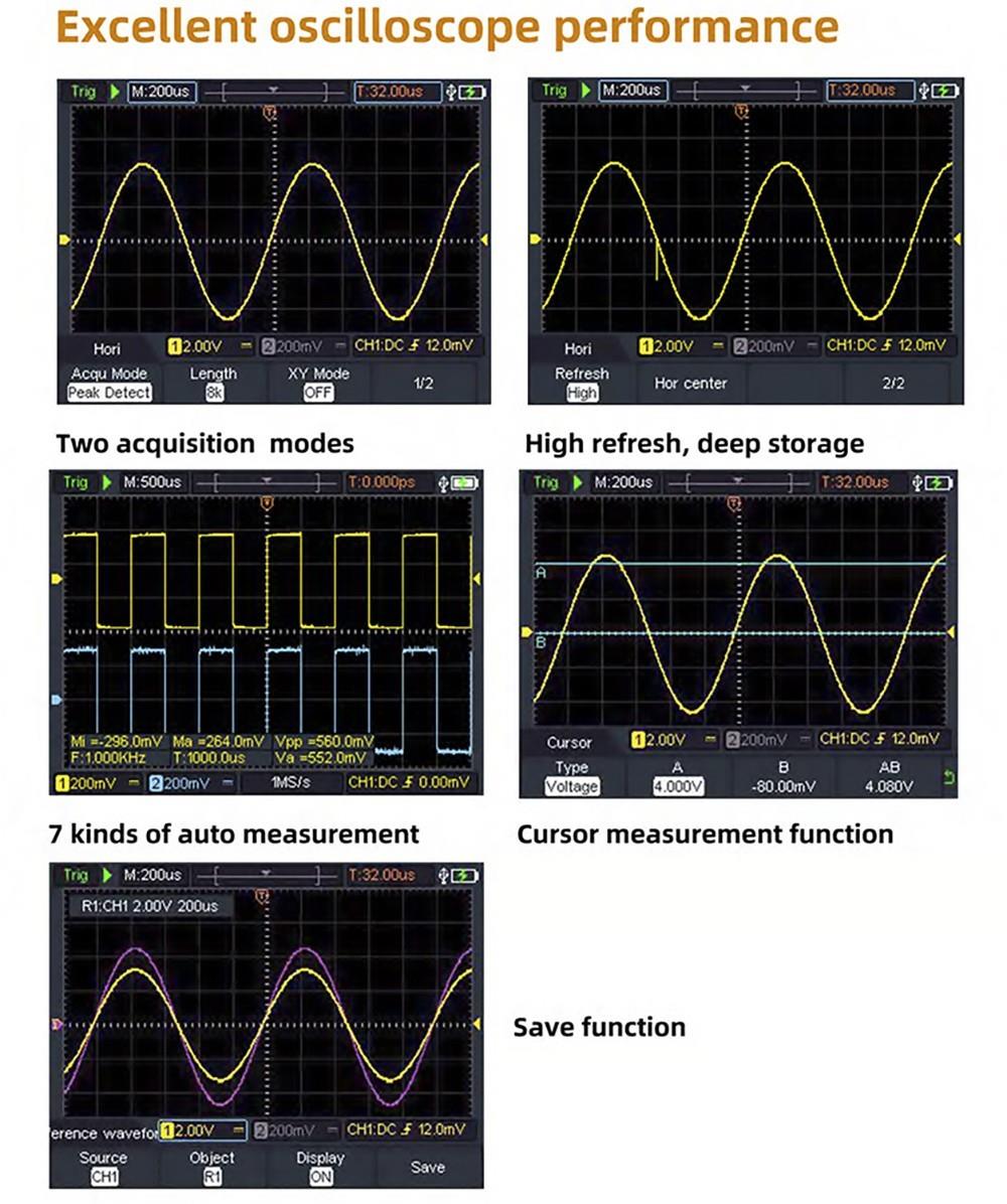 Nabízí dvoukanálový vstup, šířku pásma 200 MHz, vzorkovací frekvenci 1 GSA/s v reálném čase a maximální délku záznamu 8 kB. Má také funkci měření kurzoru a funkci automatického nastavení jedním tlačítkem, což umožňuje snadnou detekci a ladění.