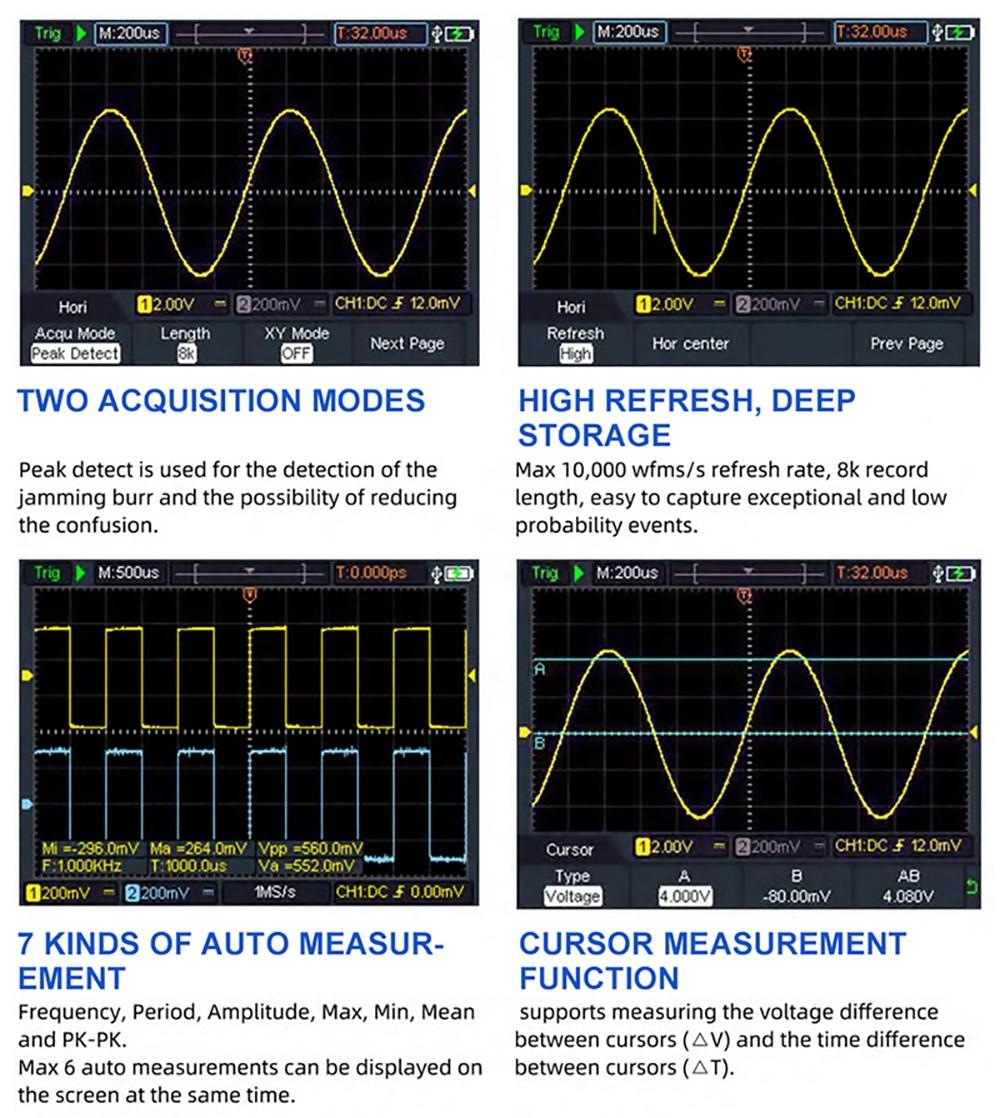 Nabízí dvoukanálový vstup, šířku pásma 70 MHz, vzorkovací frekvenci v reálném čase 250 MSa/s a maximální délku záznamu 8 kB. Má také funkci měření kurzoru a funkci automatického nastavení jedním tlačítkem, což umožňuje snadnou detekci a ladění.