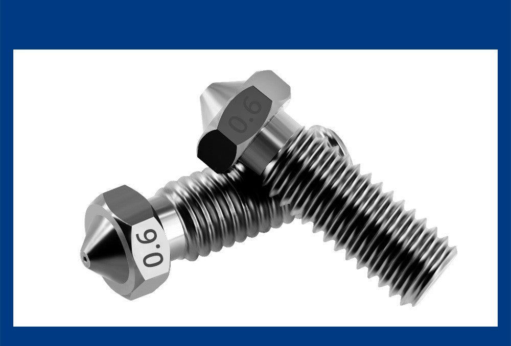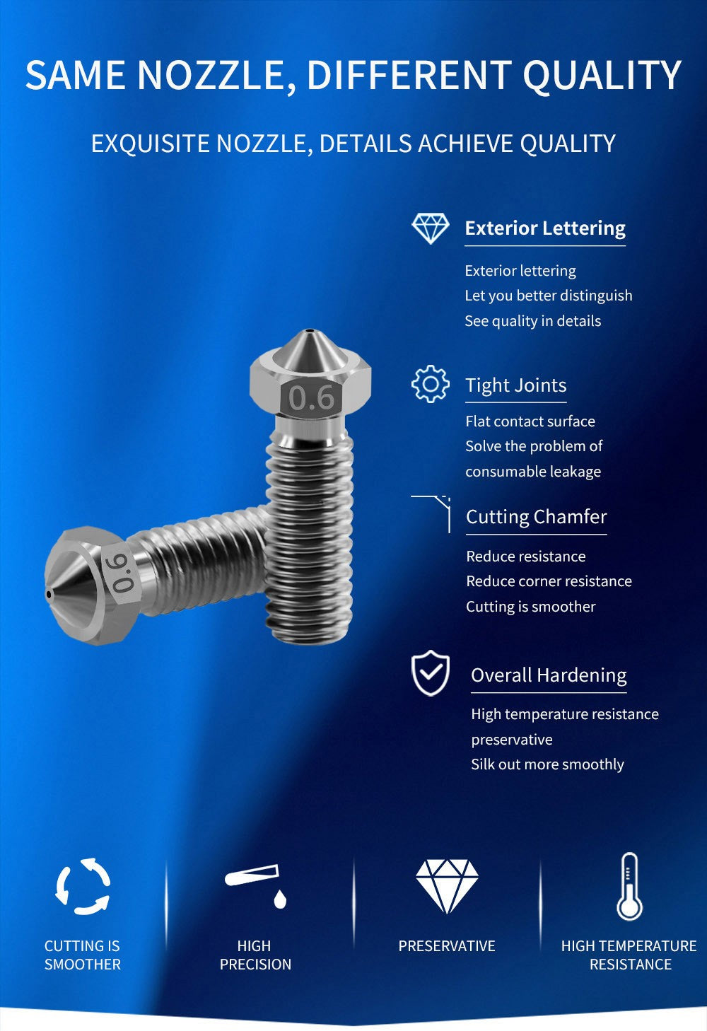 1. Tato tryska, která využívá vysoce kvalitní tepelné tvarování, vysokoteplotní cementaci a kalení, se vyznačuje vynikající odolností proti opotřebení, tepelnou odolností, vysokou tvrdostí, houževnatostí a dlouhou životností. Je kompatibilní s většinou vysokoteplotních tiskových filamentů na trhu.