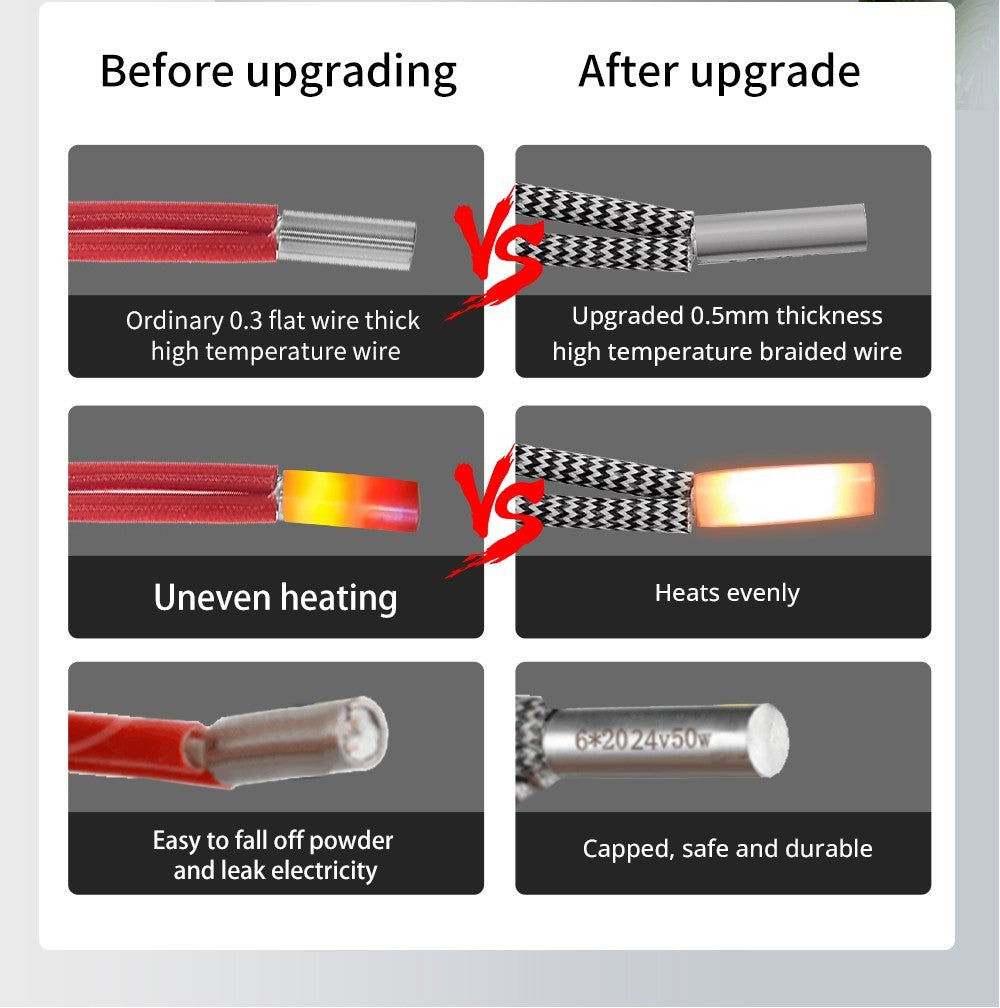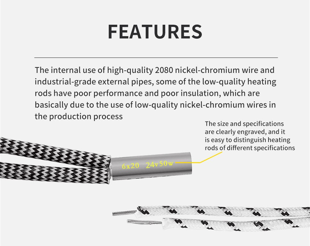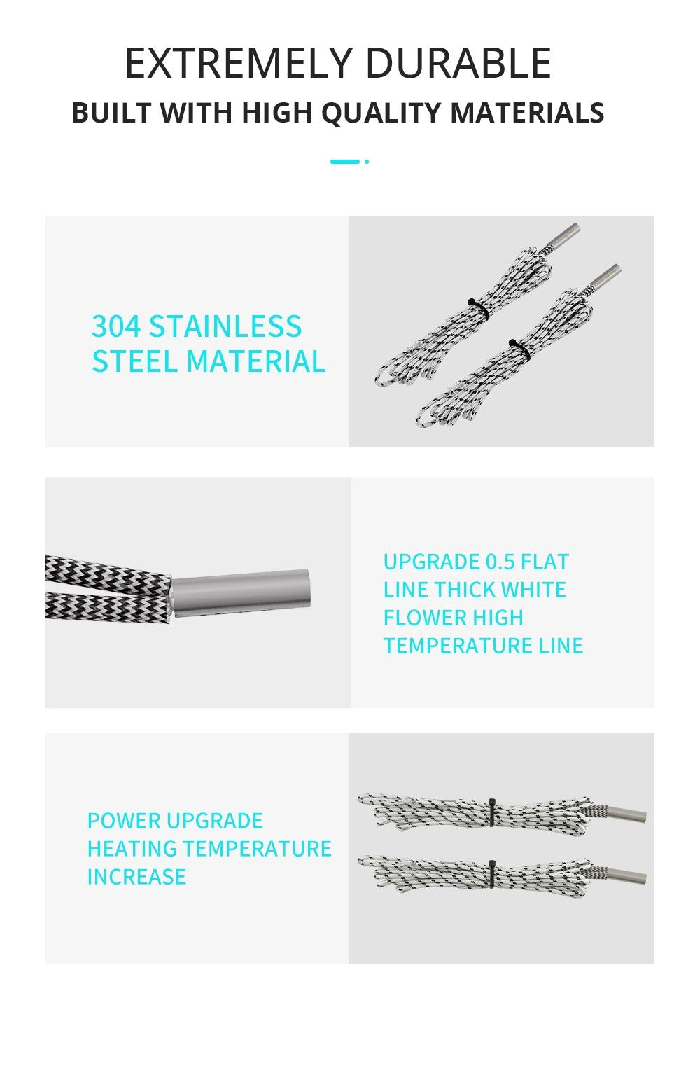 1. Od původního vysokoteplotního drátu o tloušťce 0,3 mm až po vysokoteplotní opletený drát o tloušťce 0,5 mm, tento topný robot dokáže rovnoměrně zahřívat a je bezpečný a odolný.
