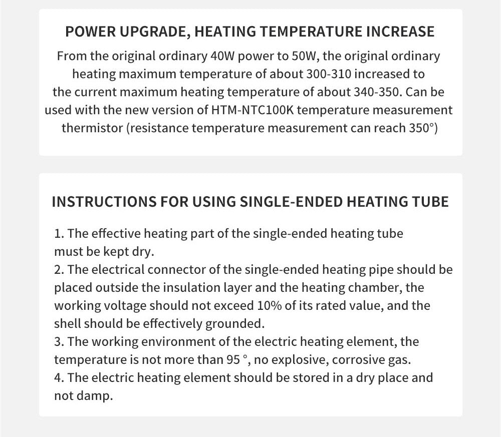 4. Má výkon 50 W a maximální teplotu ohřevu přibližně 340-350 °C. Lze jej také použít s novou verzí termistoru pro měření teploty HTM-NTC100K (měření teploty odporu může dosáhnout 350 °C).