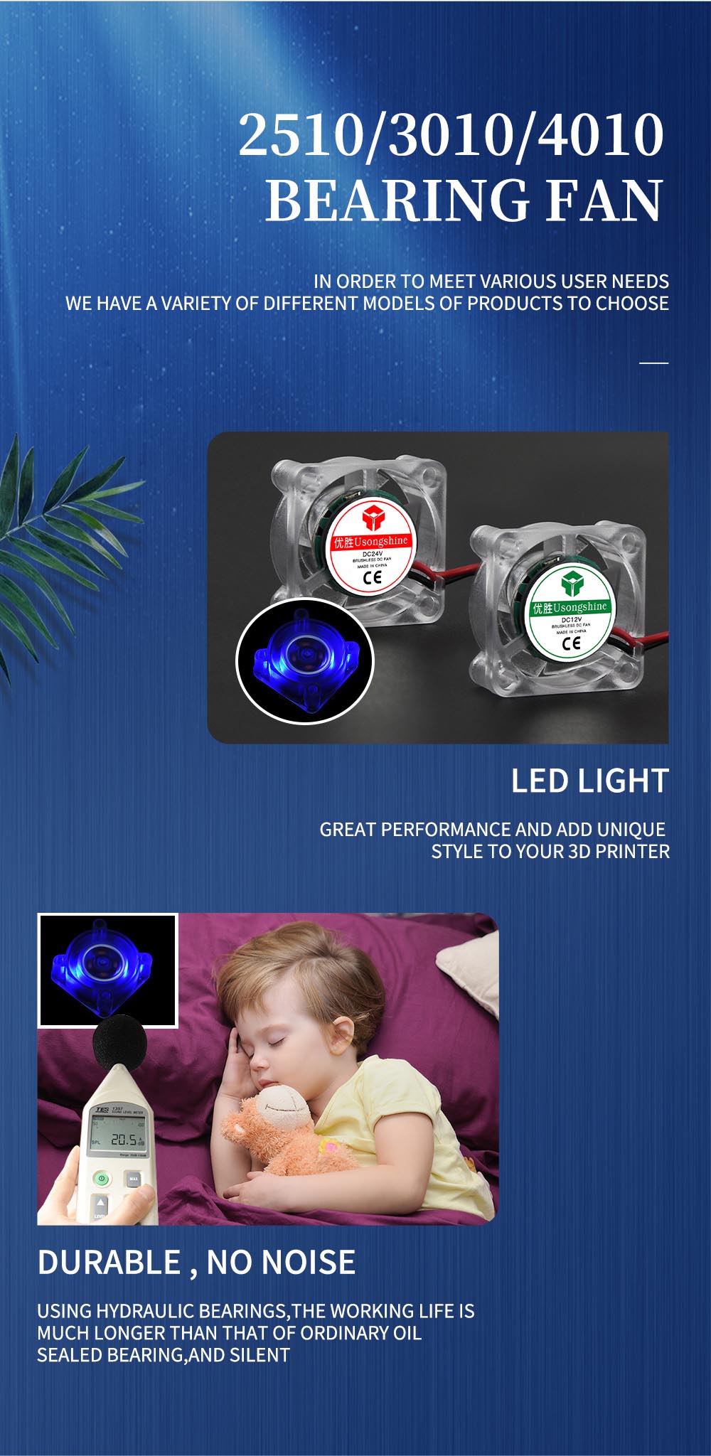 1. Chladicí ventilátor s LED světlem má skvělý výkon a dodává vašim 3D tiskárnám jedinečný styl.