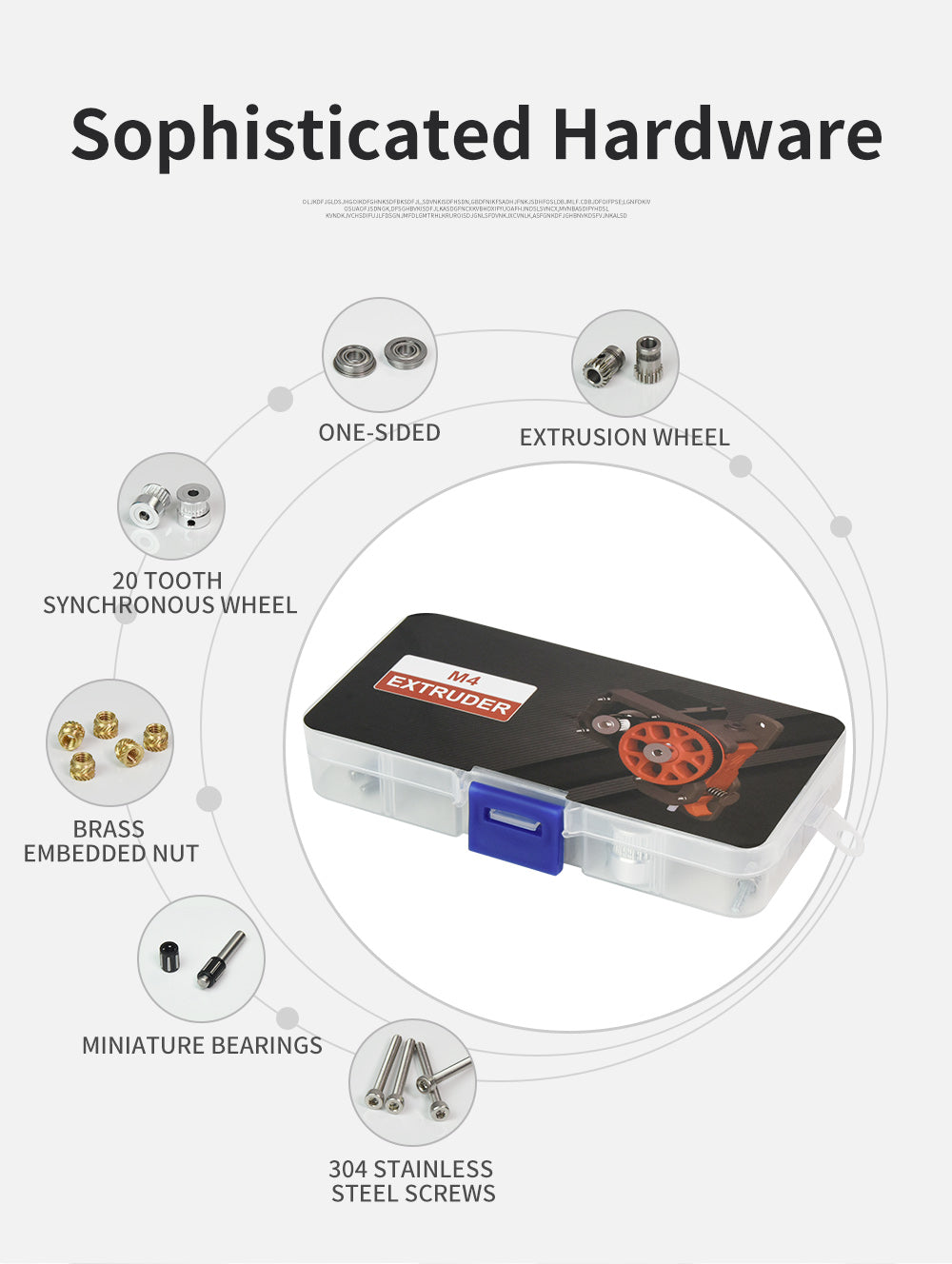Tento vylepšený extruder pro Voron M4 je odolný a snadno se nedeformuje, jeho pouzdro je potištěno PETG. (Poznámka: Motor není součástí dodávky.)