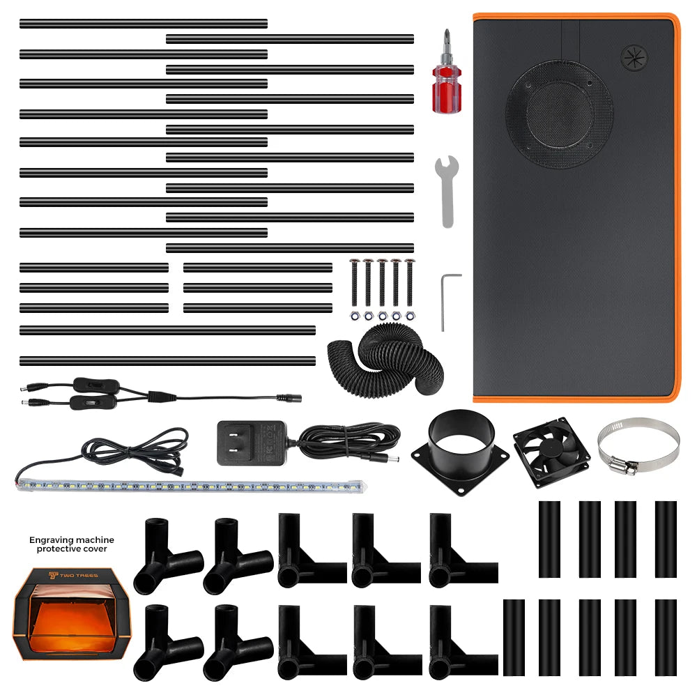 Kryt Twotrees Laser Engraver je navržen pro pohodlí a snadné použití. Je skládací a skladný, takže se v případě potřeby snadno přenáší a nastavuje. Držák z nerezové oceli poskytuje dodatečnou stabilitu a zajišťuje, že váš laserový gravírovací stroj zůstane bezpečně na svém místě. Skříň je dodávána s výstupem vzduchu a 3M dlouhým ventilačním potrubím, které lze snadno připojit k odstranění kouře a zápachu během provozu. Design skříně je nejen funkční, ale také esteticky příjemný a hladce splyne s jakýmkoli pracovním prostorem. Díky své kompatibilitě s chytrými zařízeními a kompatibilitě s většinou laserových gravírovacích strojů, včetně Two Trees, je tento kryt nutností pro každého seriózního laserového rytce.