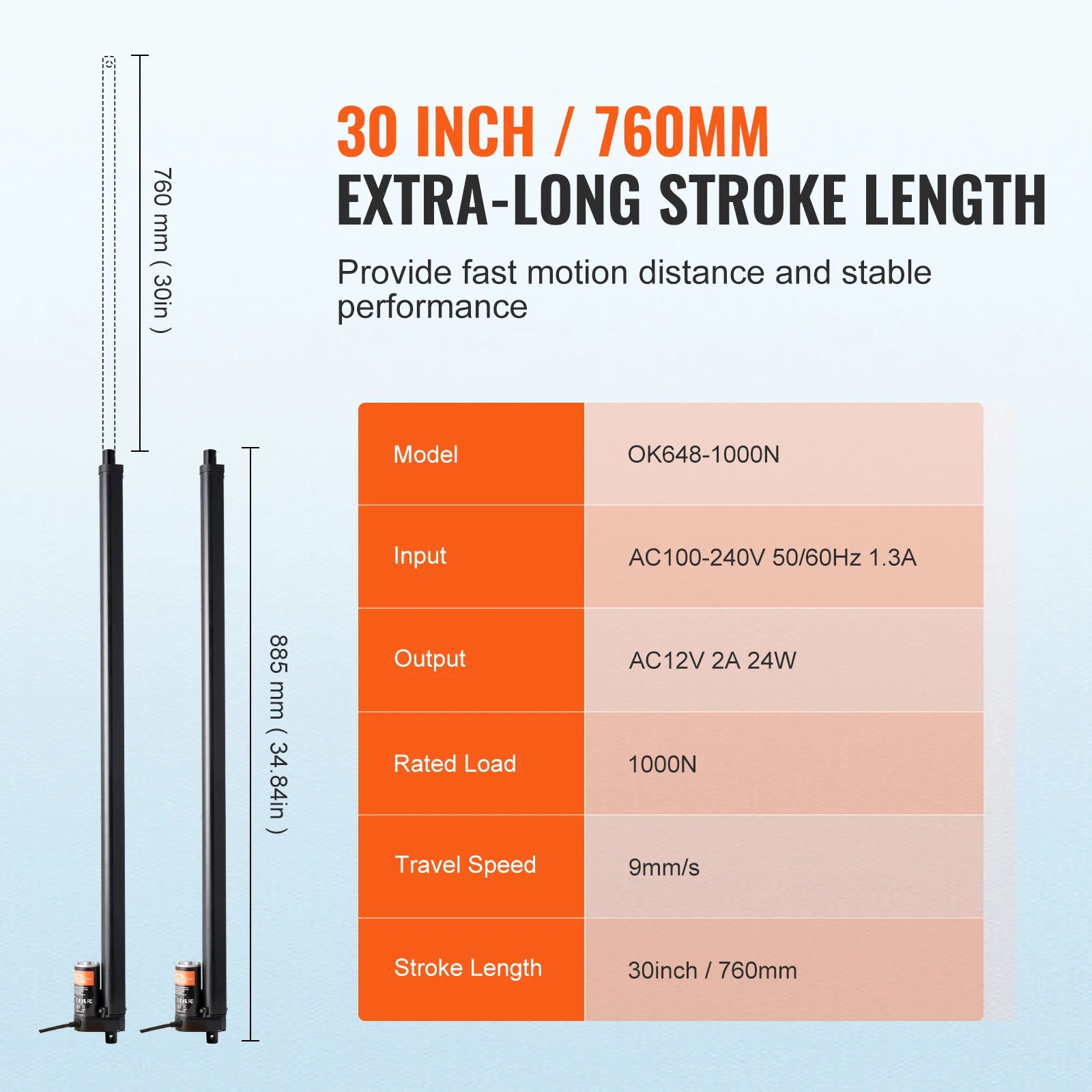 VEVOR 2PCS 12V lineární aktuátor 1000N 30palcová sada elektrického lineárního ovladače motoru IP54 Krytí pro domácí televizní stolek Zvedání pohovky