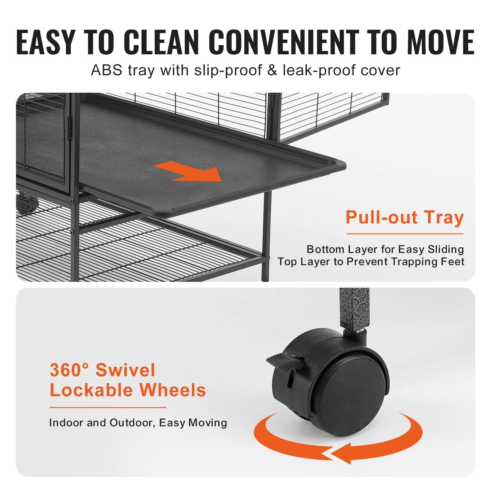 Snadno se přemisťuje a skladuje: Naše kovová klec pro domácí mazlíčky je dodávána s uzamykatelnými pojezdovými kolečky, která umožňují snadné přemisťování vašich mazlíčků z interiéru ven a umožňují jim užívat si slunečního světla a přírody. Nad kolečky je navíc velká odkládací police pro uspořádání potřeb pro domácí mazlíčky a úsporu místa.