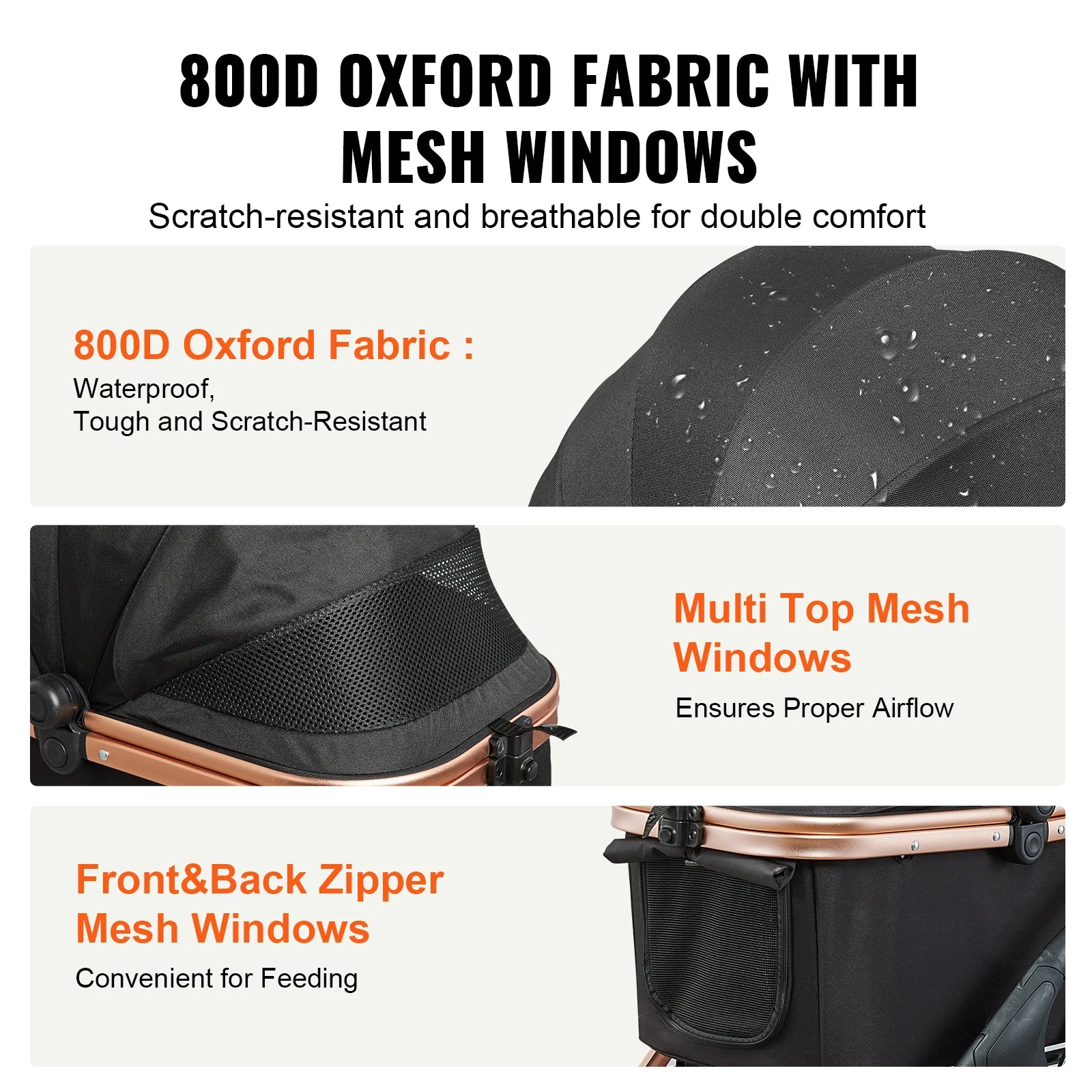 Více síťových oken kočárku poskytuje vašemu mazlíčkovi širší zorné pole a bližší spojení s vnějším světem. Pevná tkanina Oxford 800D zajišťuje, že kočárek odolá zkoušce času a zajišťuje bezpečnost a pohodlí, i když si váš mazlíček začne hrát.