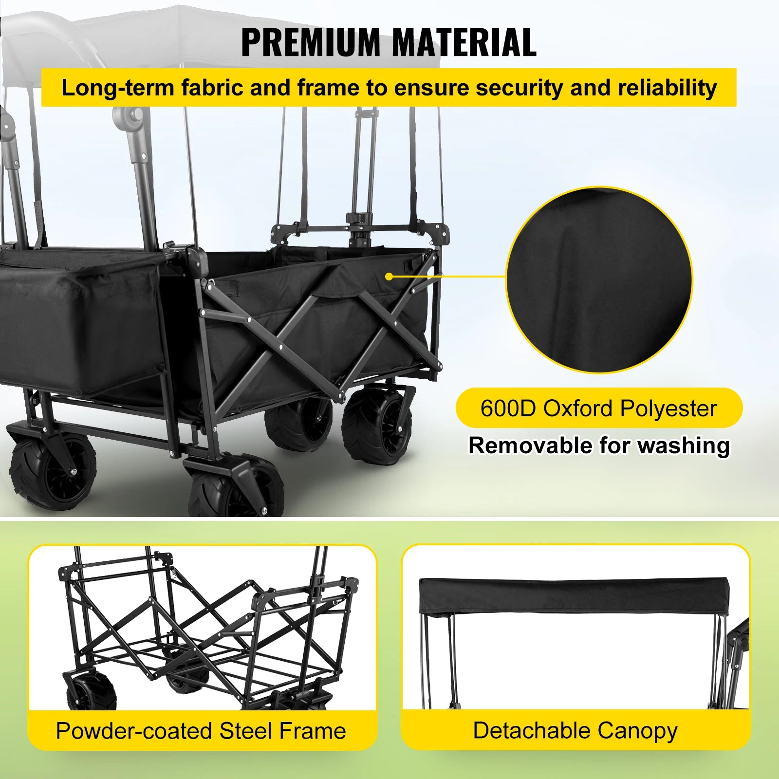 Prémiový ocelový rám: Náš skládací vůz má vysoce pevný ocelový rám s odnímatelnou 600D oxford PE tkaninou, což znamená, že může naložit vše, co chcete na venkovní piknik. Odnímatelná markýza navíc může zahodit vaše starosti s počasím.