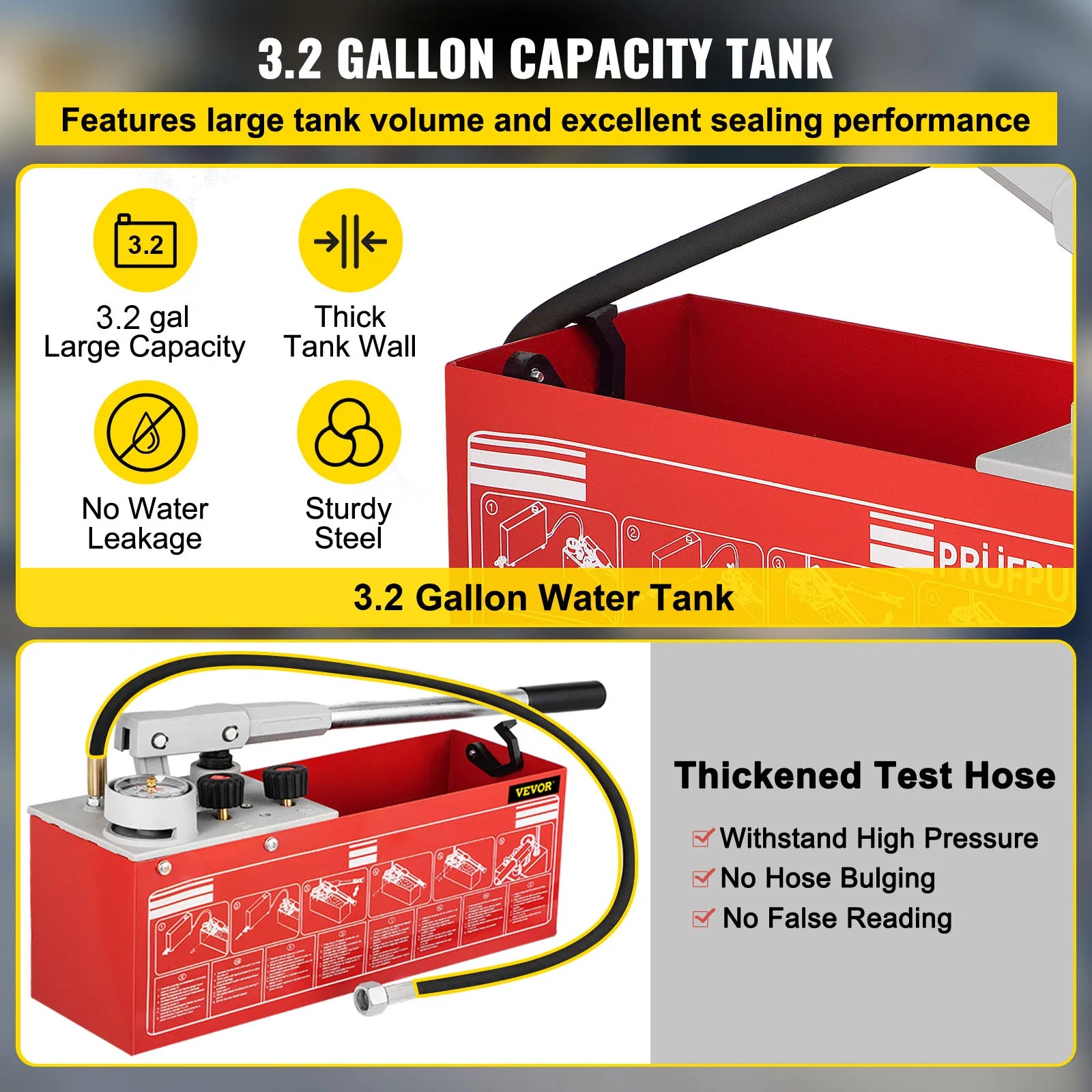 3,2 galonová vodní nádrž: Tato přenosná ruční pumpa je dodávána s 3,2 galonovou vodní nádrží, navrženou se zesílenou stěnou a vynikajícím těsnicím výkonem, takže není snadné uniknout po delší dobu. Zkušební hadice vydrží vysoký tlak a zajistí přesné čtení.