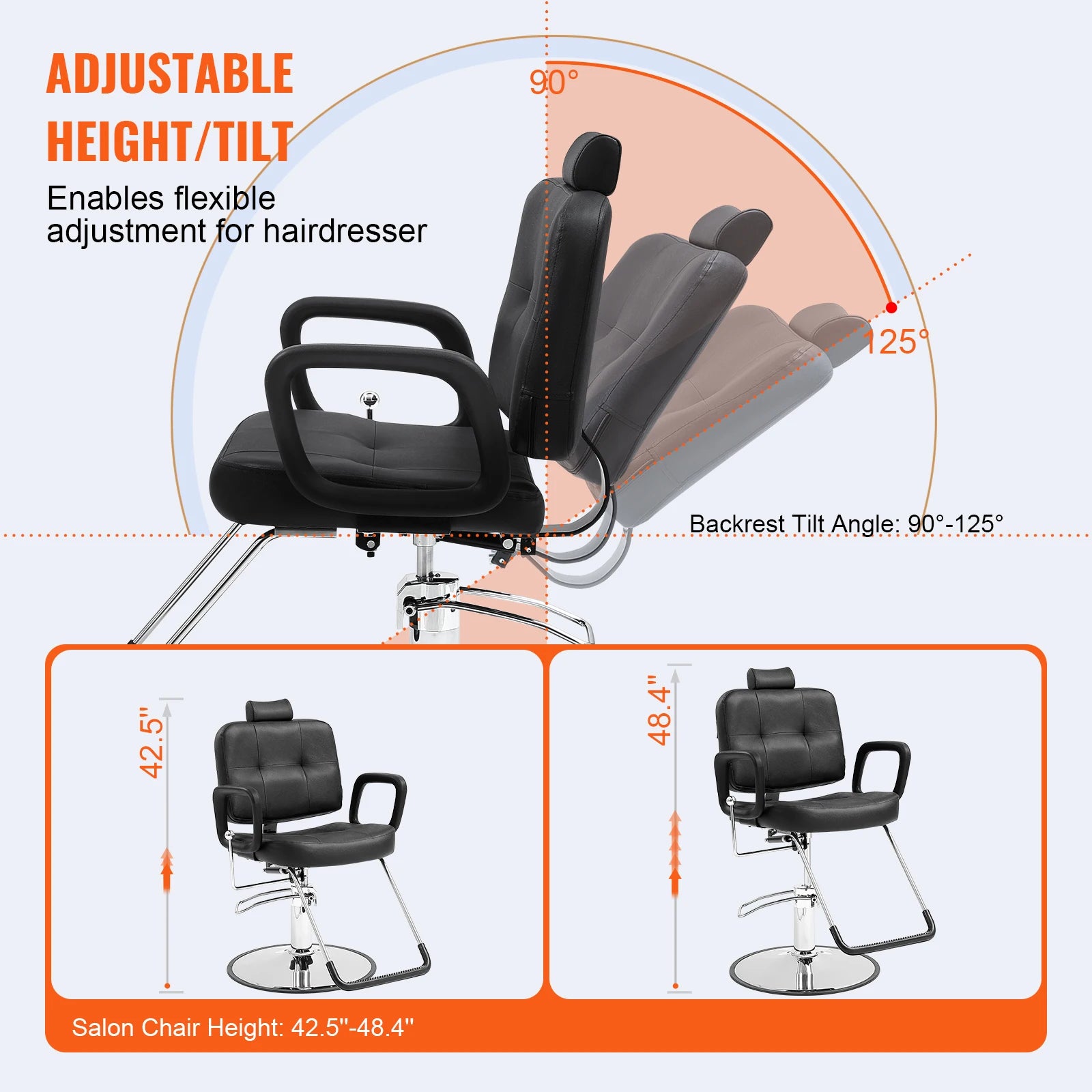 Snadné nastavení: Výšku holičského křesla lze nastavit od 42,5" do 48,4" (1080-1230 mm) stisknutím páky hydraulického čerpadla nohou. Pomocí boční páky sklopte opěradlo od 90° do 125°. Užijte si funkci otáčení o 360°. Nastavitelná výška opěrky hlavy nabízí pohodlí pro profesionály v salonu.